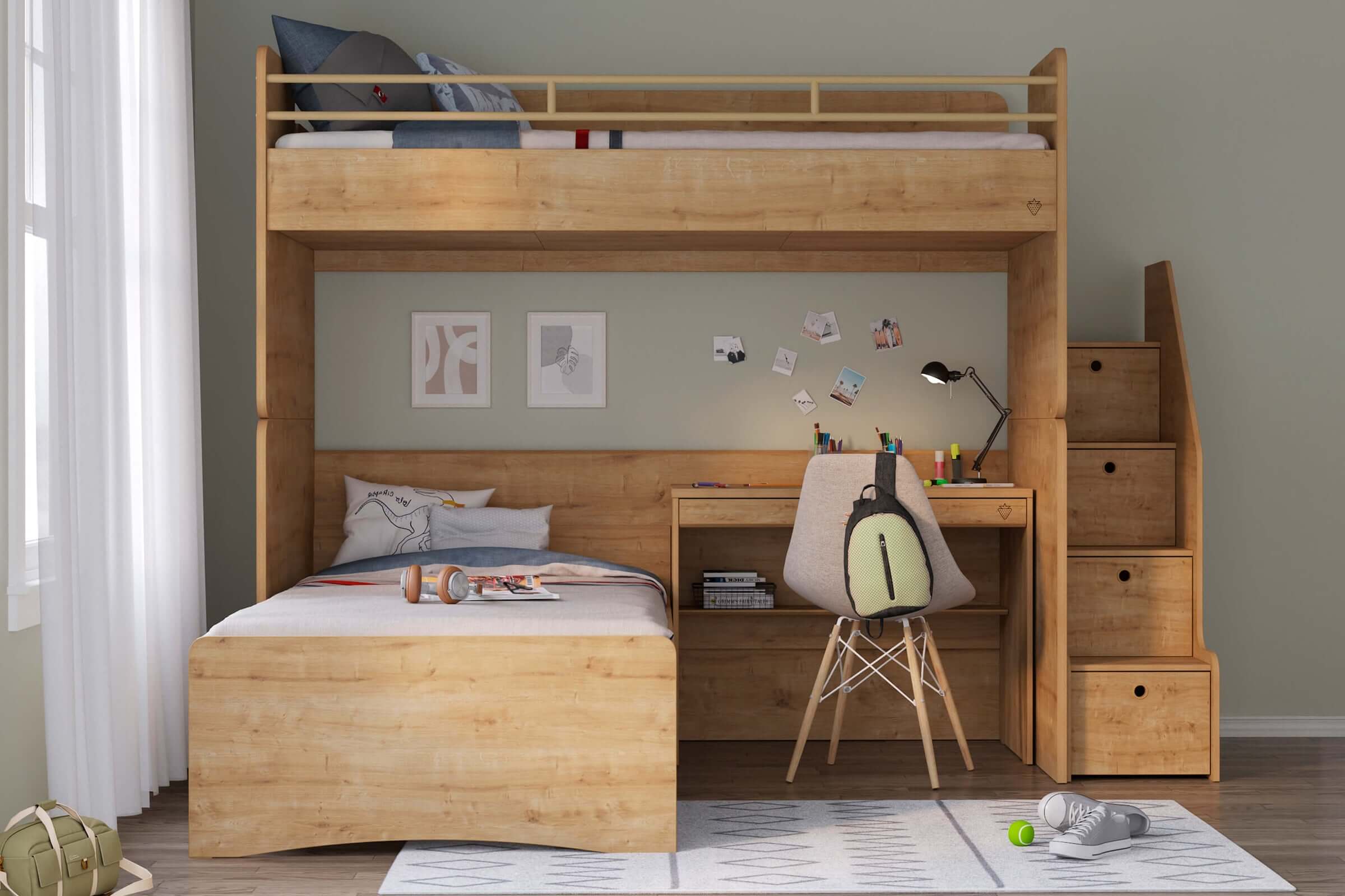 Il letto castello 3 posti unisce un matrimoniale inferiore (120 × 200 cm) a un singolo superiore (90 × 200 cm), ospitando tre persone in meno di quattro metri quadrati. La scala laterale funge da cassettiera capiente e la pedana intermedia può essere trasformata in una piccola libreria.