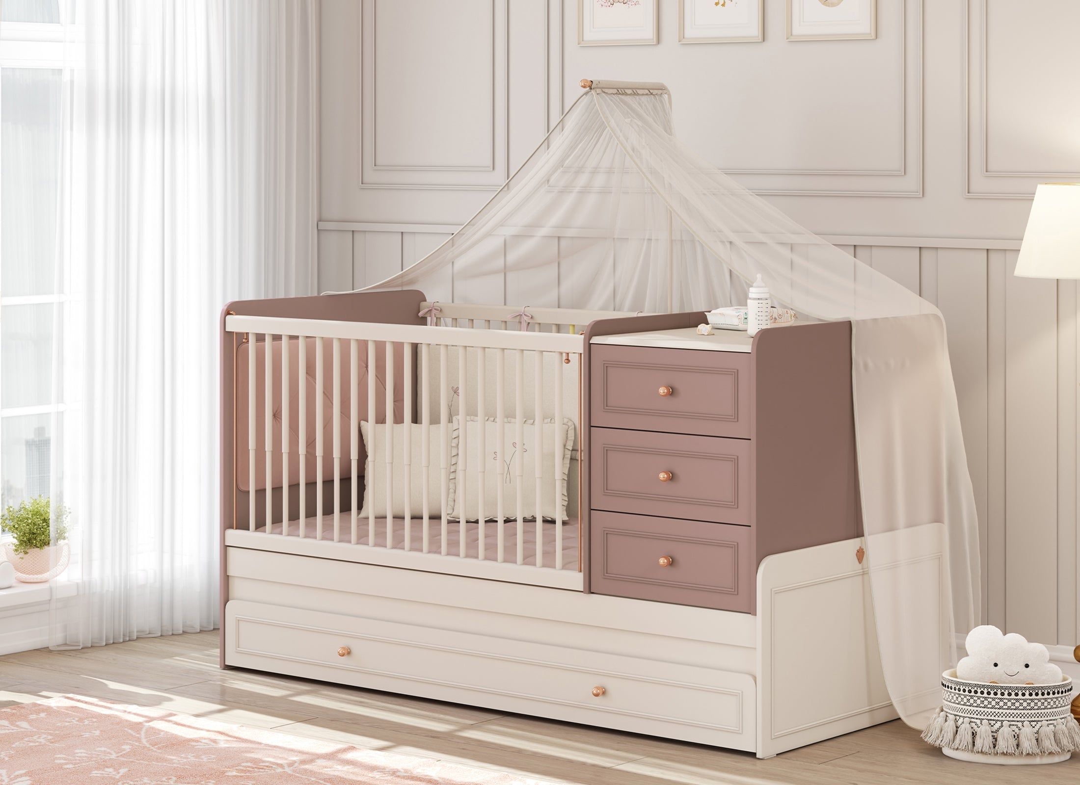 Il fondo della culla è regolabile su tre livelli, adattandosi alla crescita del bambino. I cassetti a chiusura silenziosa permettono interventi notturni senza disturbare il sonno.