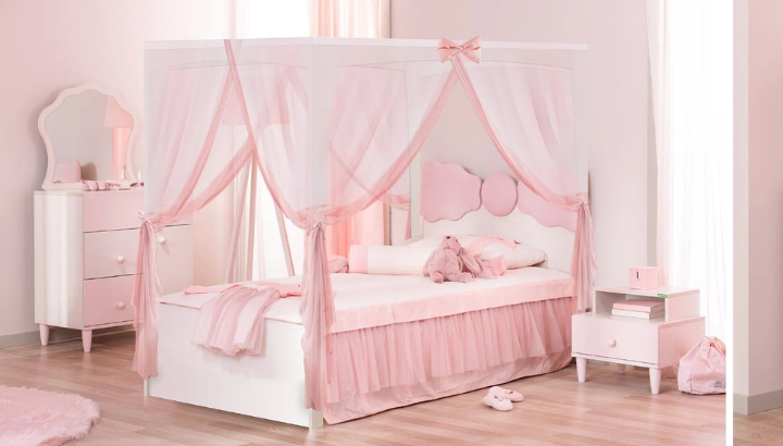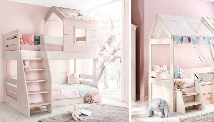 Le camerette per bimbe spesso puntano su tonalità delicate come il rosa cipria, il lilla o il bianco. Si possono arricchire con tessuti morbidi, tende leggere, specchi decorativi e letti con baldacchino. I mobili possono includere armadi con maniglie a forma di fiore o stelle e scaffali a tema fiabesco.