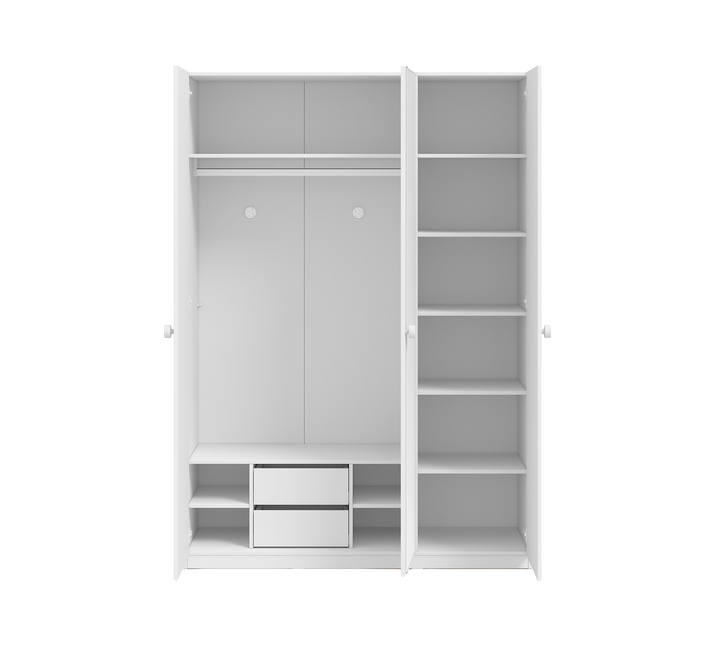 Design a 3 ante; specchio sul coperchio centrale, 2 cassetti sul lato sinistro e ripiani multipli. Barra appendiabiti, cerniere con freno e maniglie in legno. Sono presenti tappo di ventilazione e dispositivo di fissaggio a parete anti-ribaltamento.