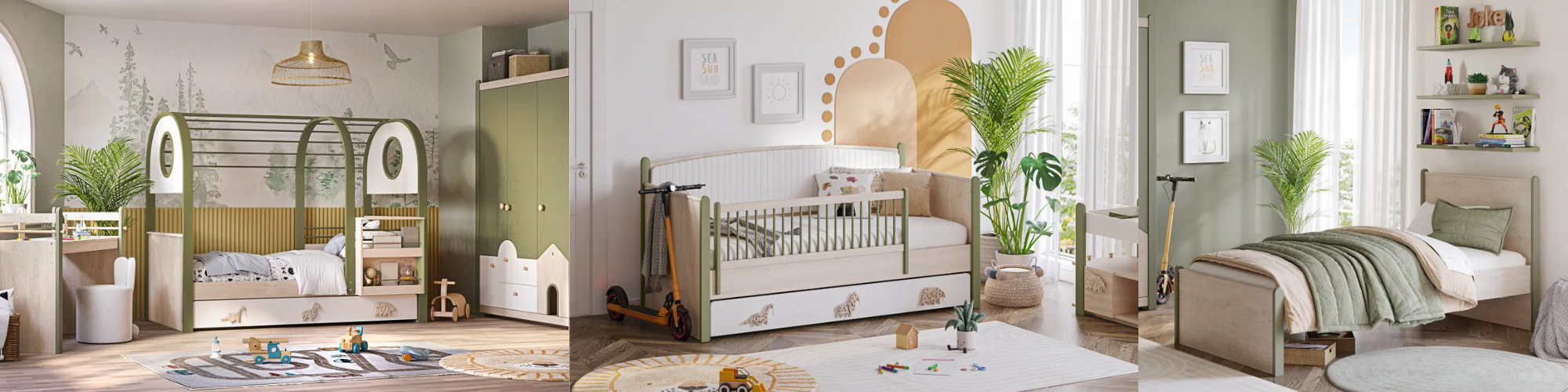 Inspiriert von der Montessori-Pädagogik, fördert die Joy-Linie die Selbstständigkeit und Bewegungsfreiheit von Kleinkindern. Mit ihren beruhigenden Salbeigrüntönen und dem natürlichen Holz bringt dieses Kinderzimmer Natur und Ruhe direkt in Ihr Zuhause.