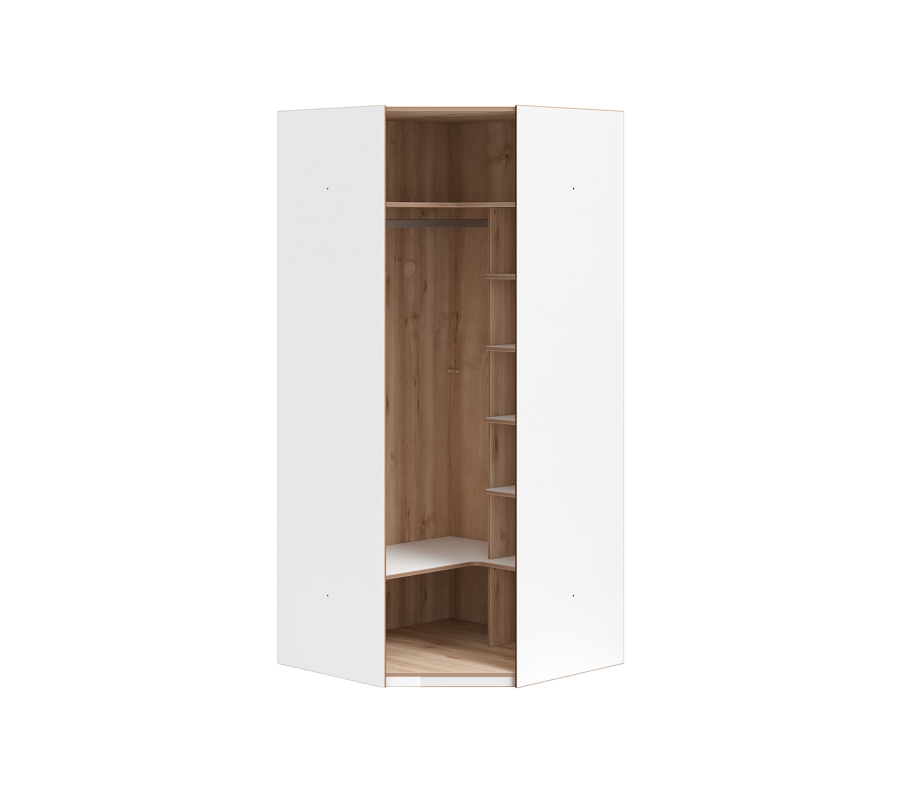 Die eleganteste Art, den Platz optimal zu nutzen: der Eckkleiderschrank Mocha. Dieser Schrank wurde speziell für die Nutzung ungenutzter Ecken in Ihrem Zimmer entworfen und bietet dank seines kompakten Designs eine funktionale und ästhetisch ansprechende Aufbewahrungslösung.