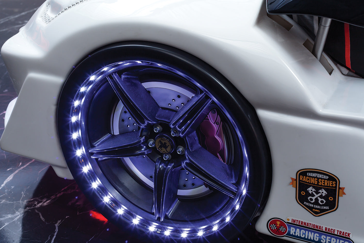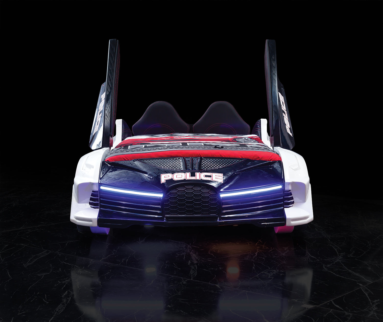 Dieses Modell ist für Standardmatratzen der Größe 90 x 190 cm konzipiert und verfügt über ferngesteuerte Funktionen. Es bietet vier verschiedene Modi: Motorengeräusch, Lichtsteuerung, Zündeffekt und die bekannte Titelmelodie der Fernsehserie „Knight Rider (KITT)“. So werden die Fantasie der Kinder angeregt und das Zubettgehen noch unterhaltsamer.