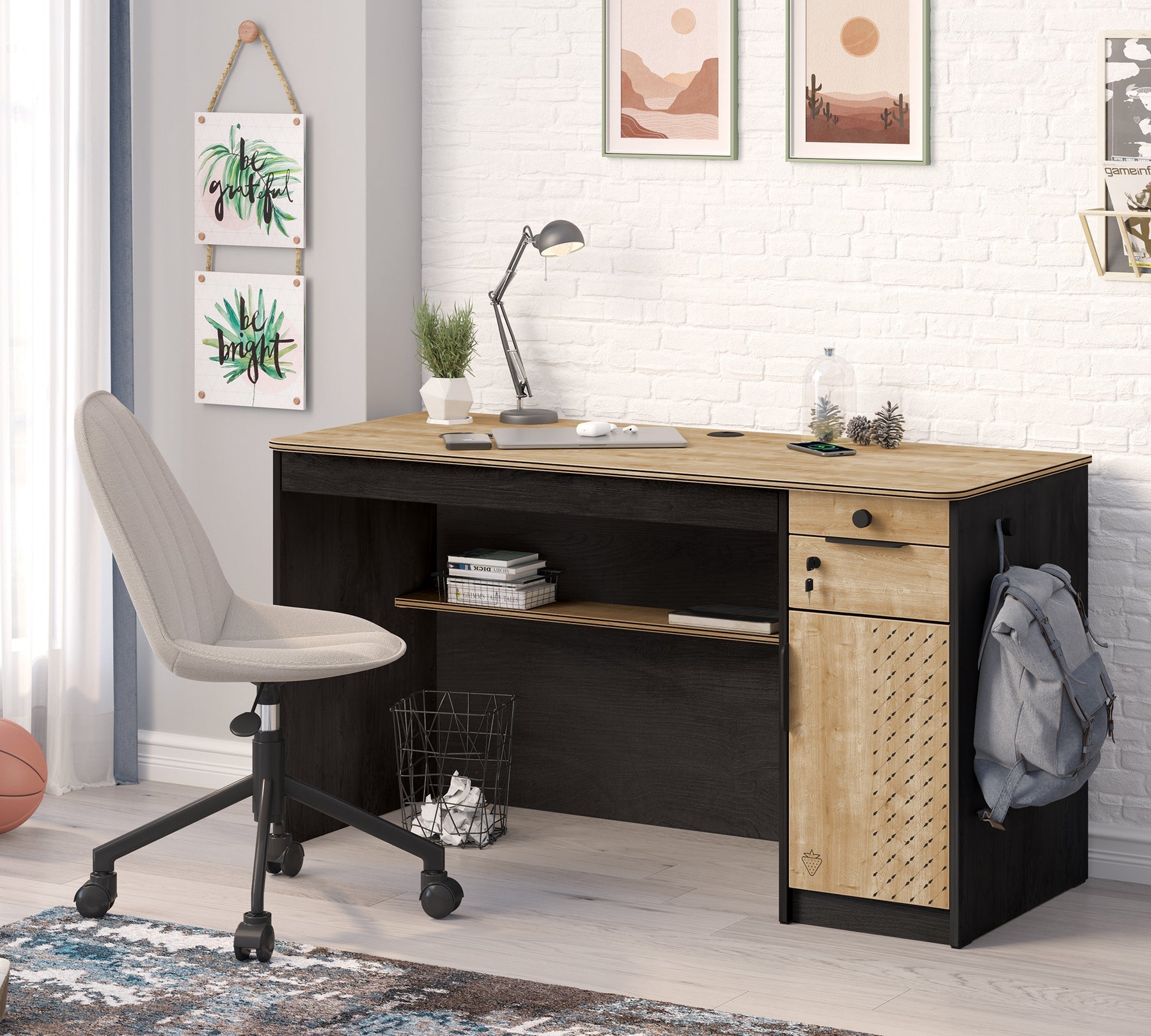 Der schwarze Schreibtisch wurde speziell für die Bedürfnisse junger Menschen in ihrem Lernbereich entwickelt und vereint Funktionalität und Komfort. Mit seinen drei Schubladen, dem Schrank mit Türen, der Garderobenleiste und dem Einlegeboden sorgt er für Ordnung im Kinderzimmer. Eine der Schubladen ist abschließbar.
