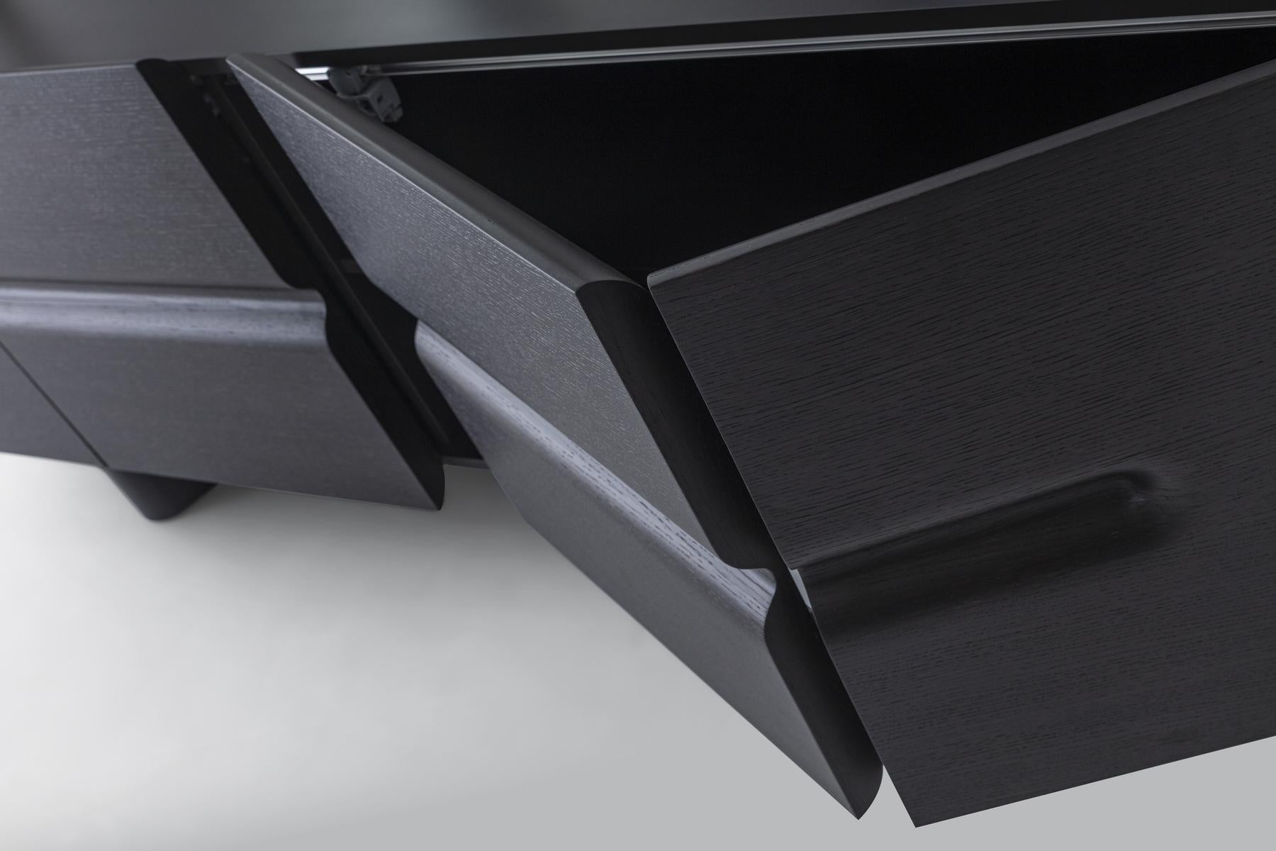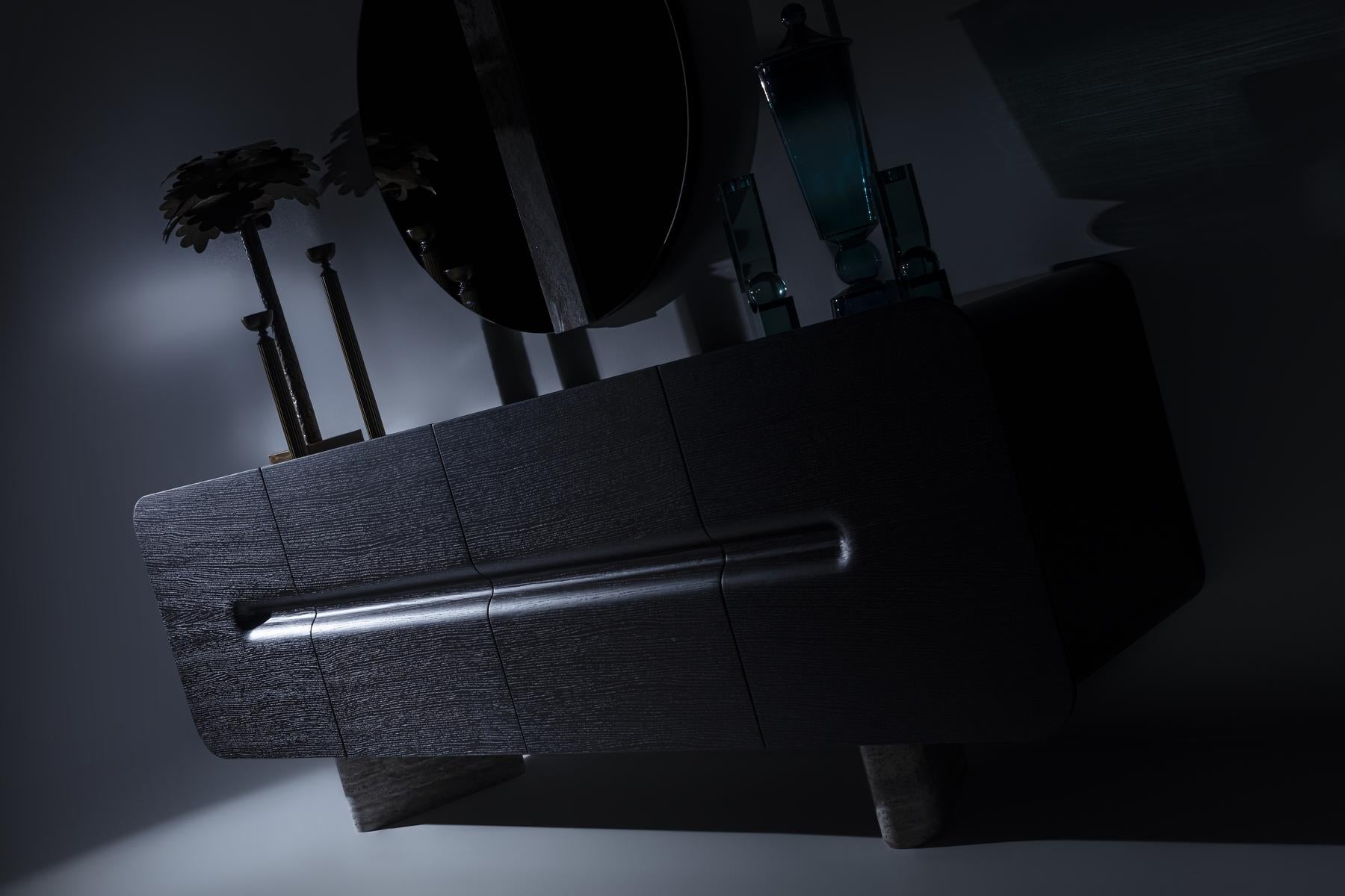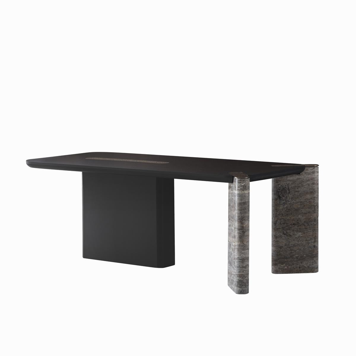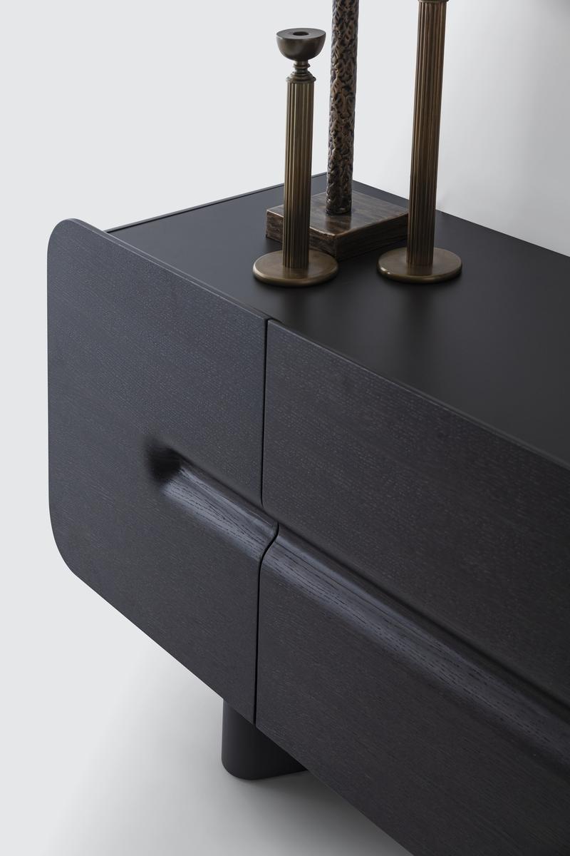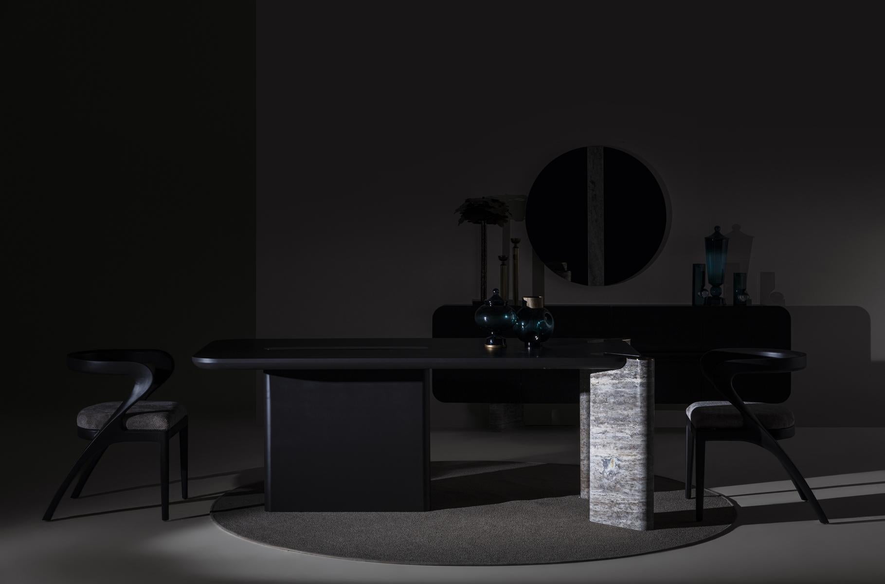 Das Esszimmer-Set Maybach Black Oak verleiht jedem Raum dank der Kombination aus schwarz gebeiztem Massivholz und Details aus echtem Marmor eine anspruchsvolle, moderne Ästhetik. Die weichen Linien, abgerundeten Oberflächen und die imposante Struktur schaffen eine zeitgemäße Eleganz, die in jedem Wohnraum hervorsticht.