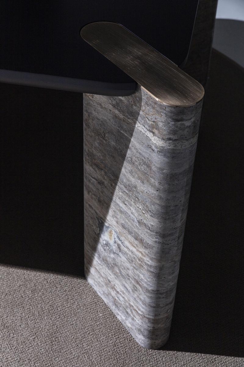 Der Esstisch mit seinen kunstvoll geschnitzten Marmorbeinen verleiht dem Raum eine skulpturale Note, während der passende Konsolentisch, ebenfalls mit Marmordetails versehen, Funktionalität und Stil vereint. Ergonomische Stühle runden das Ensemble ab und bieten dank ihrer gepolsterten Sitze und geschwungenen Gestelle maximalen Komfort.