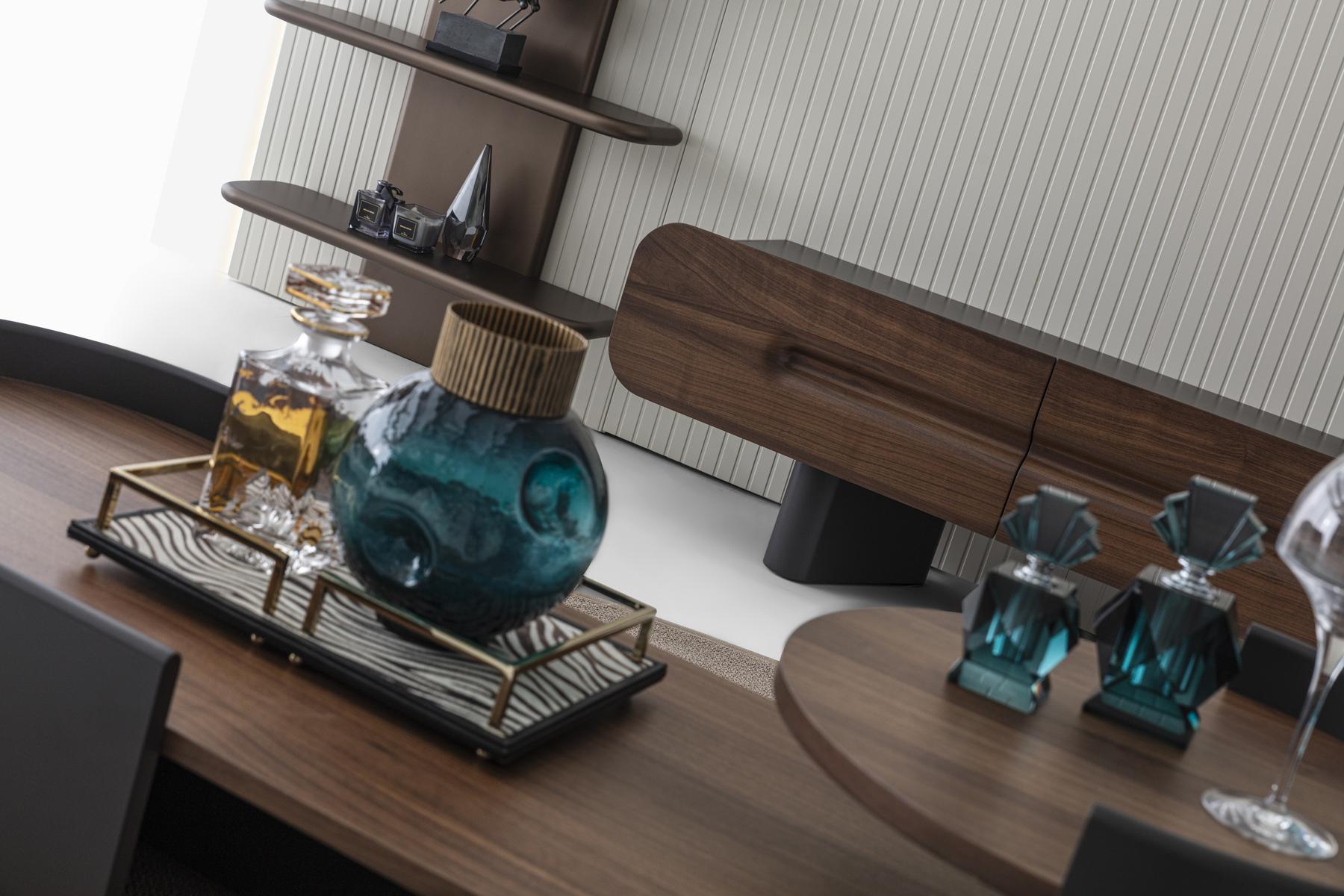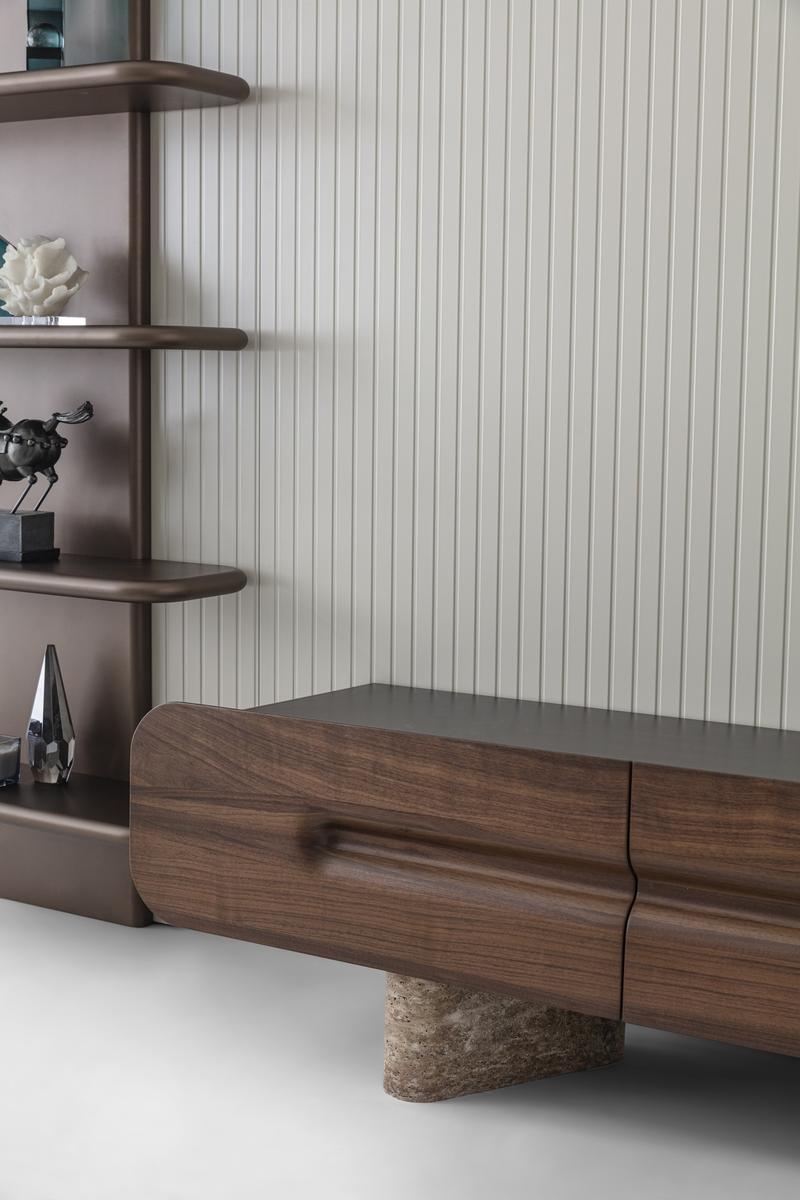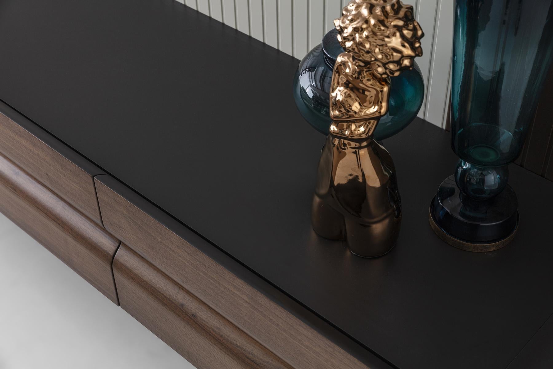 Das TV-Möbel Maybach aus Walnussholz vereint moderne Eleganz und Funktionalität dank seiner weichen Linien, abgerundeten Details und der warmen Walnuss-Oberfläche. Die großzügigen Ablageflächen bieten idealen Stauraum für Multimediageräte, Dekoartikel und Alltagsgegenstände, während die solide Konstruktion für Langlebigkeit und Stabilität sorgt. Es ist die perfekte Ergänzung für jeden Wohnbereich und harmoniert mit anderen Möbeln der Maybach-Kollektion.