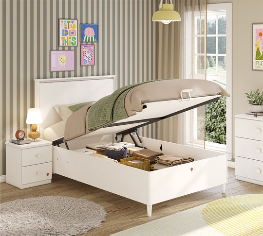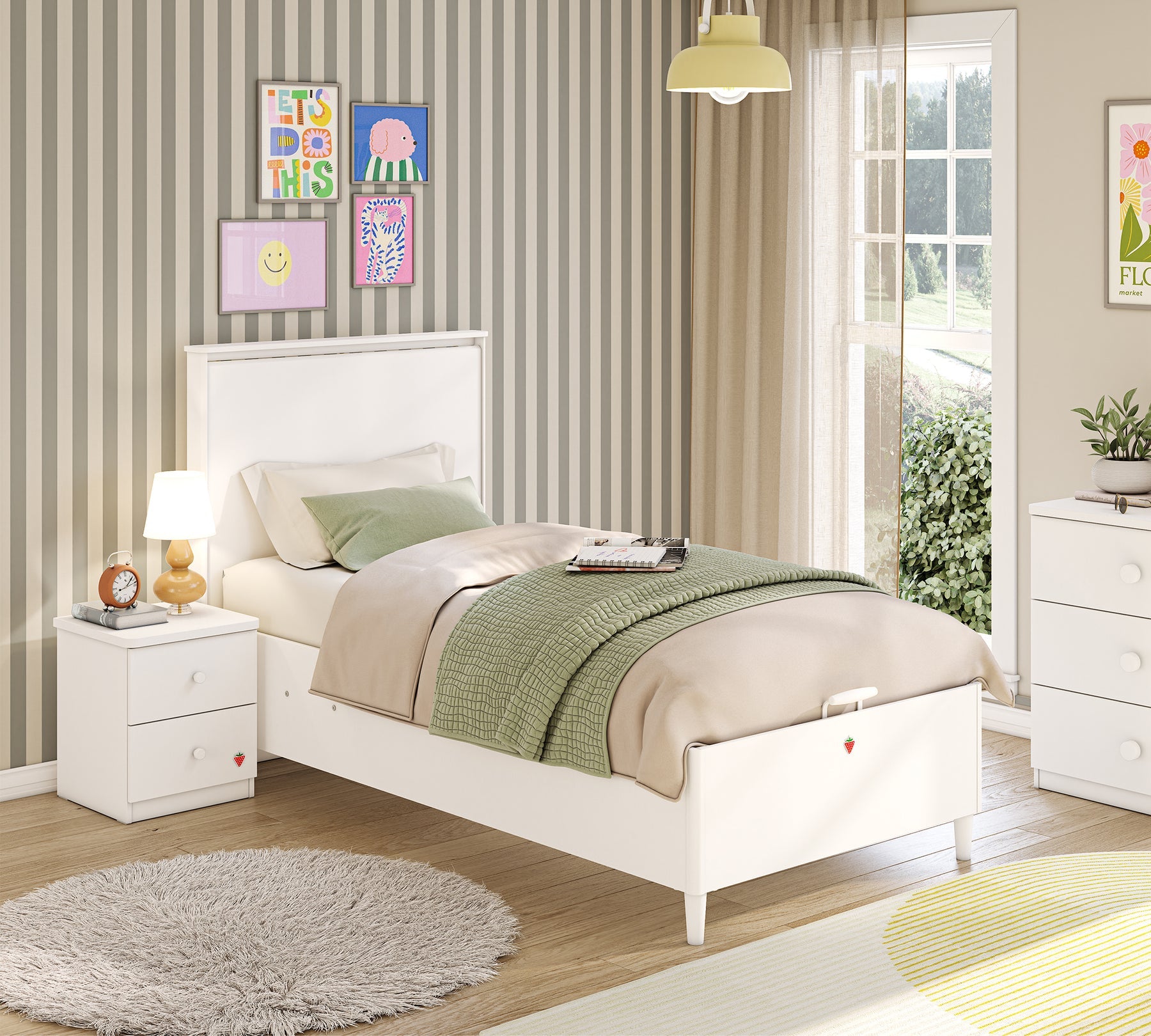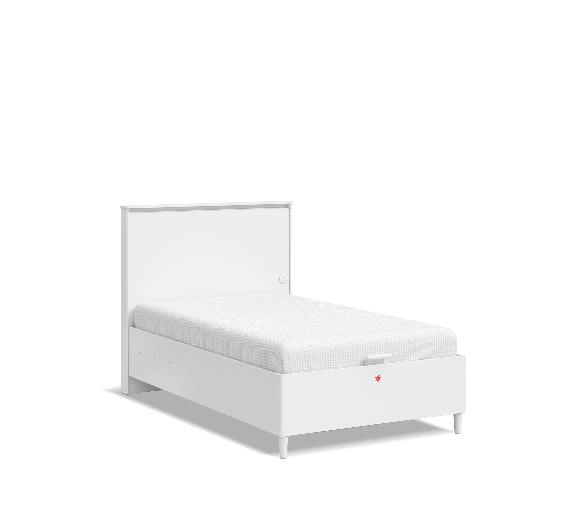 Varia Bett in Weiß mit flachem Kopfteil. Abgerundete Details am Fußende, dreiteiliger Lattenrost und H-förmige Latten. 2 mm starke Kanten. Maximale Belastbarkeit 130 kg. Elektrostatisch beschichtete Metallteile.