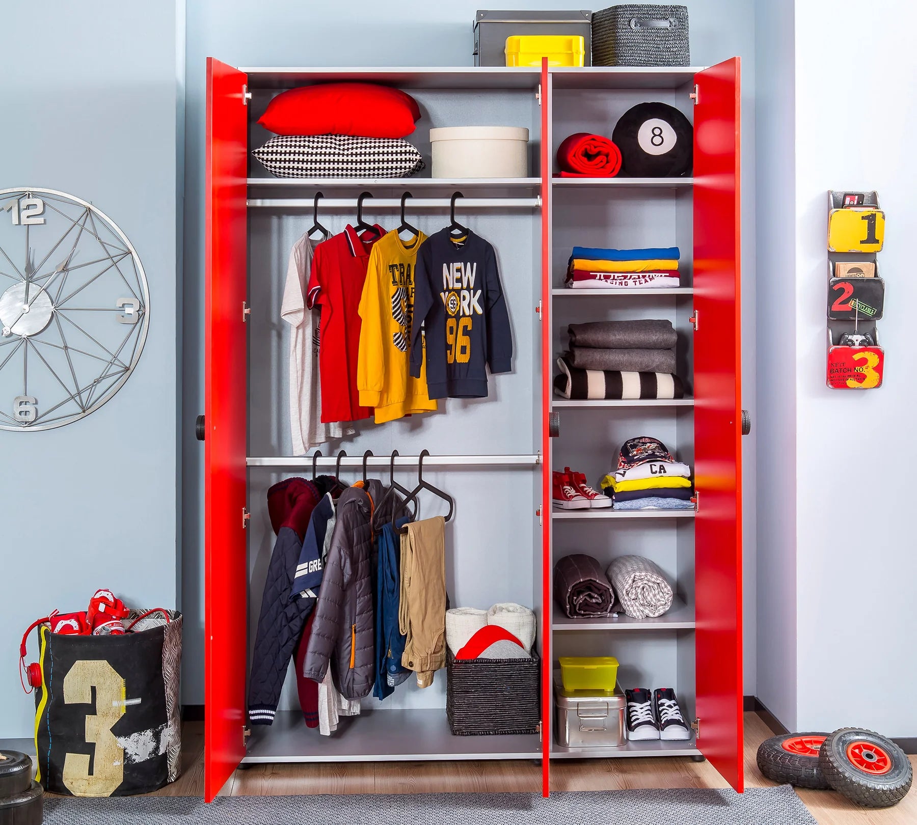 Armadio a 3 Ante Racecup: Ampio e funzionale, dotato di due aste appendiabiti e numerosi ripiani. Il tocco magico? Le maniglie a forma di ruota e le chiusure ammortizzate "soft-close" che garantiscono silenzio e sicurezza contro lo schiacciamento delle dita.