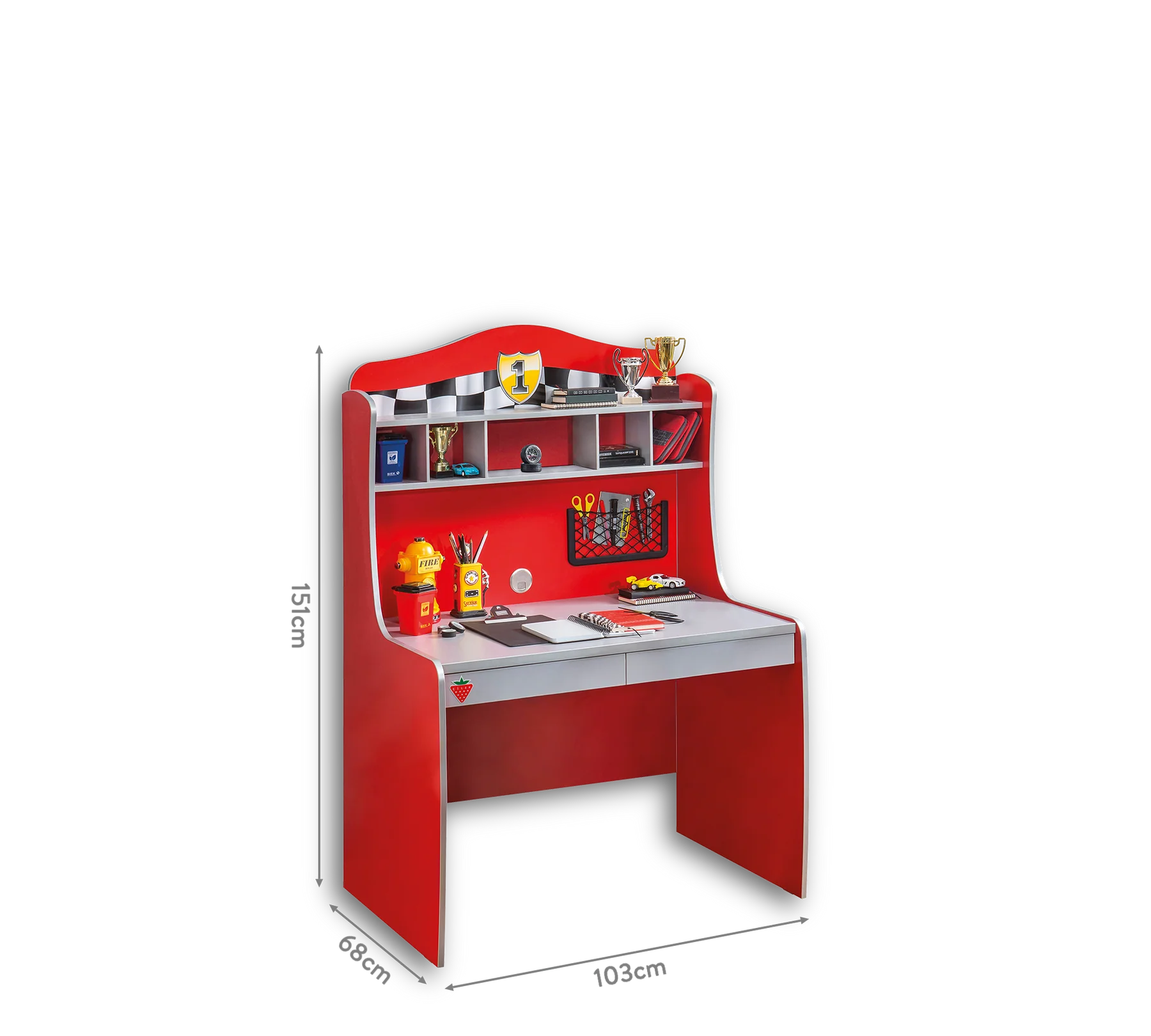 Scrivania con Unità Studio: Una postazione di lavoro ergonomica con due grandi cassetti e un’unità superiore dotata di mensole e pratiche tasche a rete. I bordi arrotondati assicurano protezione costante durante lo studio e il gioco.