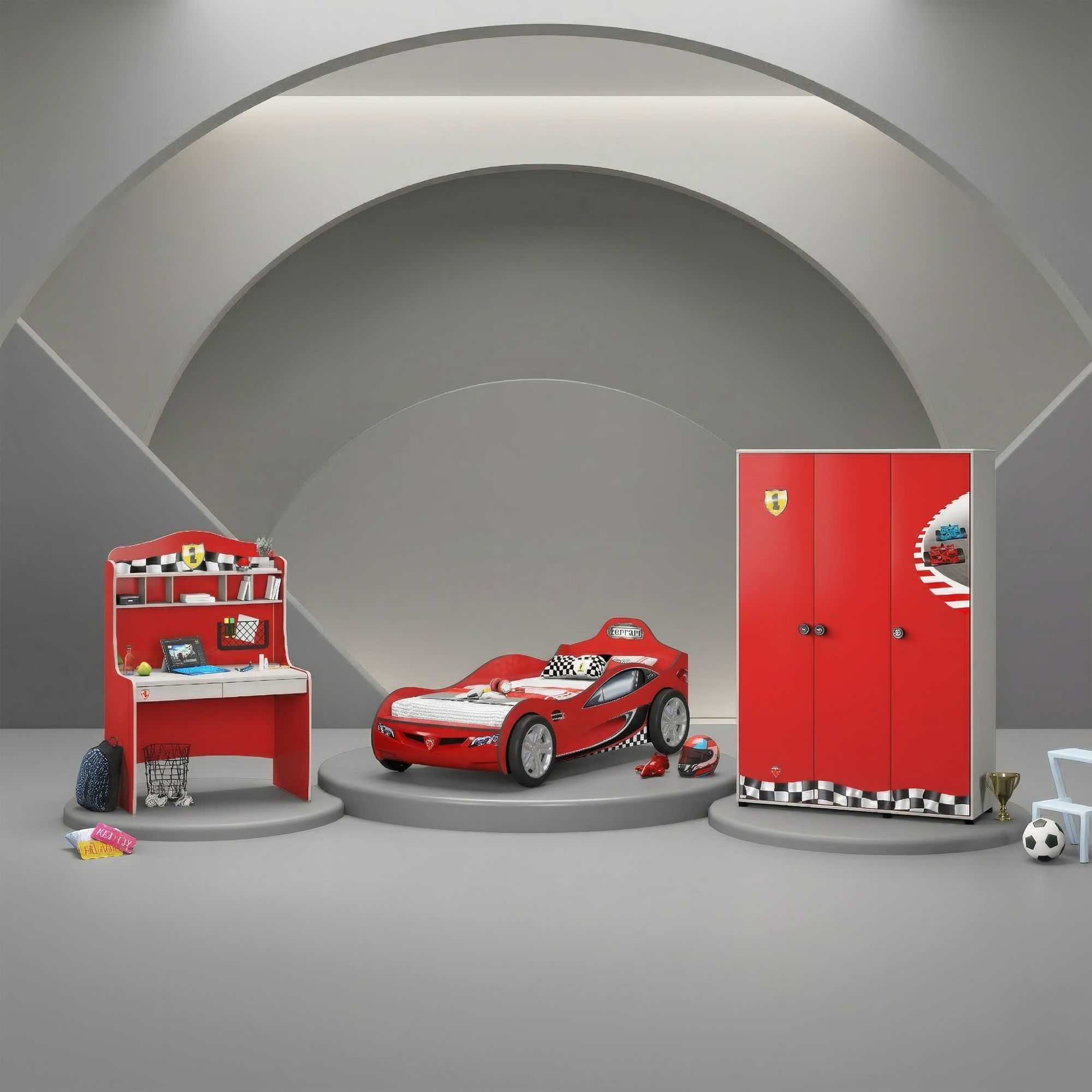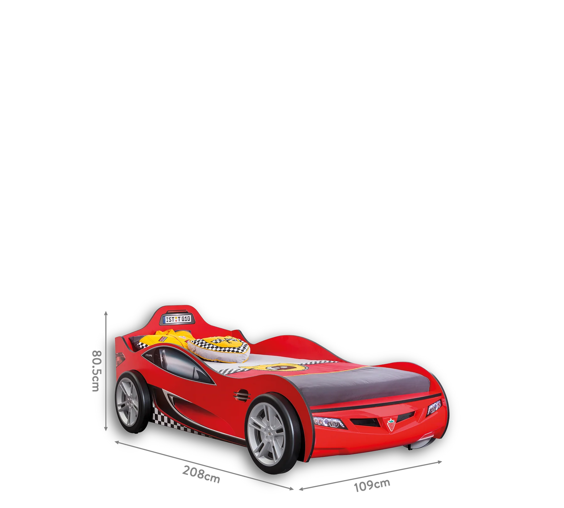 - Letto a forma di Macchina Racecup Rosso (90x190 cm): Una struttura dal design sportivo con angoli arrotondati per la massima sicurezza. Le grafiche a tema corse e la finitura opaca donano un look autentico e moderno, perfetto per sognare grandi vittorie.