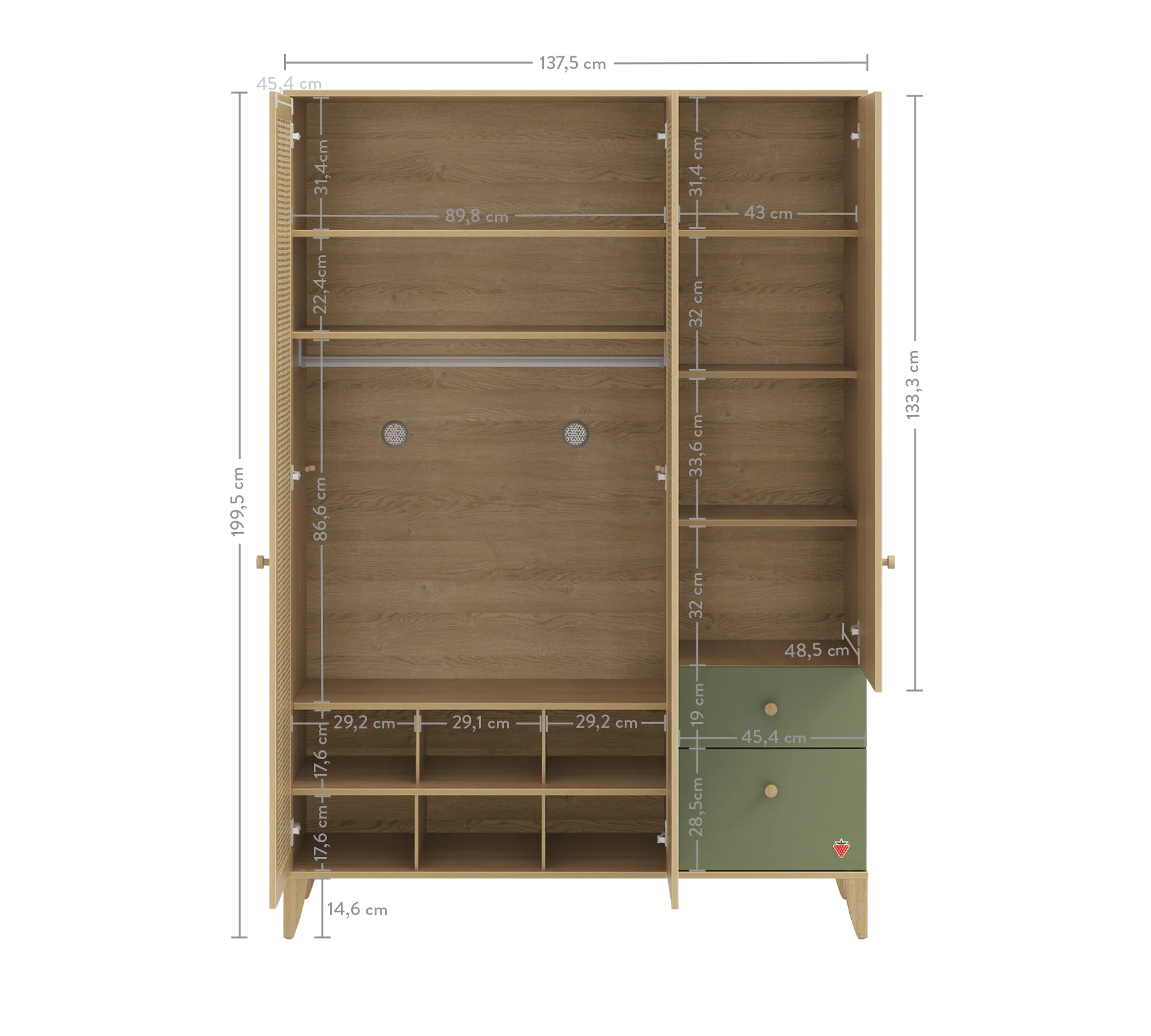 Armario de 3 Puertas Loof Baby: Espacio y orden en constante crecimiento. Ofrece una amplia barra para colgar, numerosos estantes y dos amplios cajones con guías de cierre lento. Las puertas están equipadas con bisagras amortiguadas para un uso silencioso. Incluye cápsulas de aire anti-golpes, esquinas redondeadas y kit de fijación a la pared gratuito para una seguridad total.