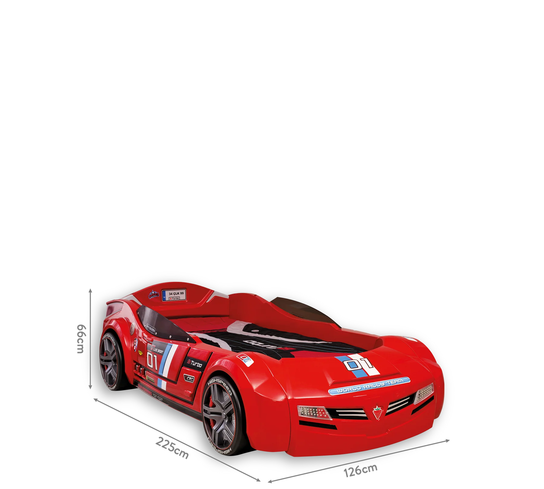 Cama Coche Biturbo (Rojo): El corazón palpitante de la habitación. Equipada con luces LED, efectos de sonido realistas y control remoto para una experiencia interactiva única. Fabricada con líneas redondeadas y materiales seguros (poliestireno), con ruedas 3D y detalles muy cuidados.