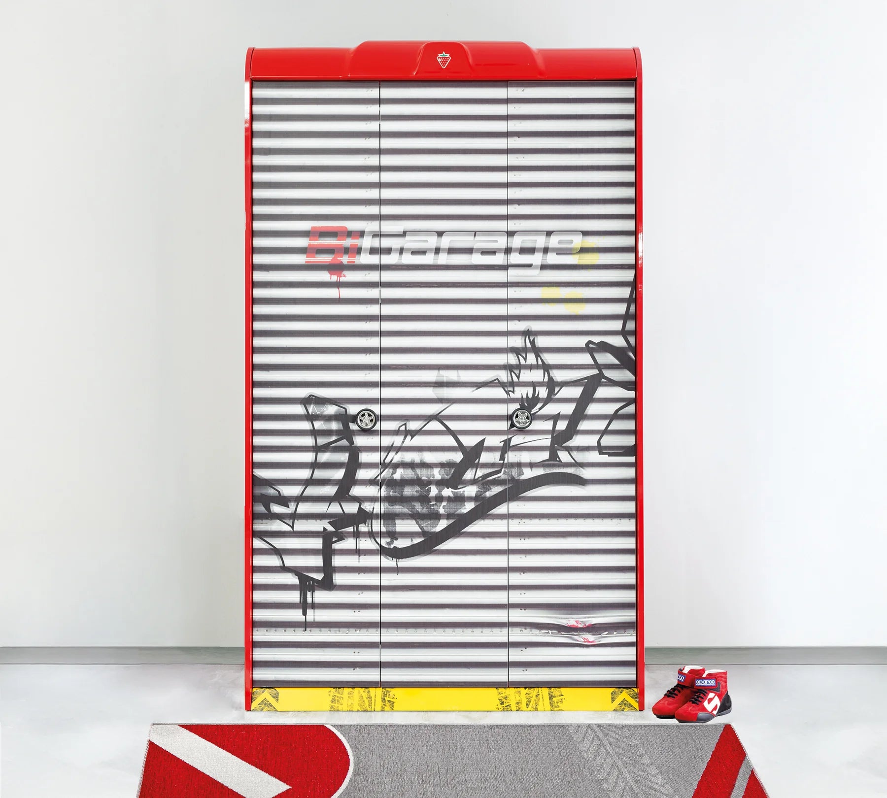 Armario de 3 Puertas "Garage": Un diseño revolucionario con apertura de fuelle (acordeón) que recrea la atmósfera de un verdadero box de carreras. Incluye tiradores temáticos GT, amplios estantes y cajones para organizar todo el equipo de tu piloto.