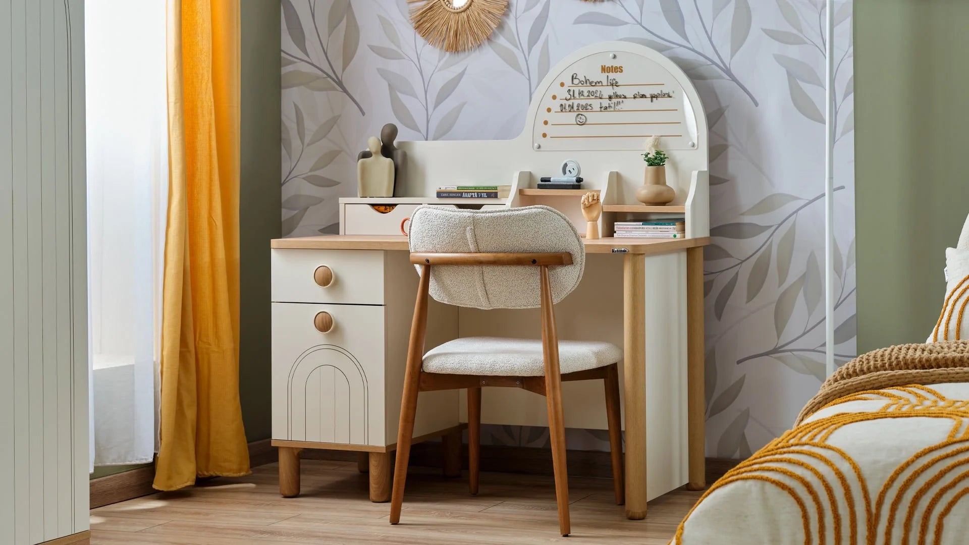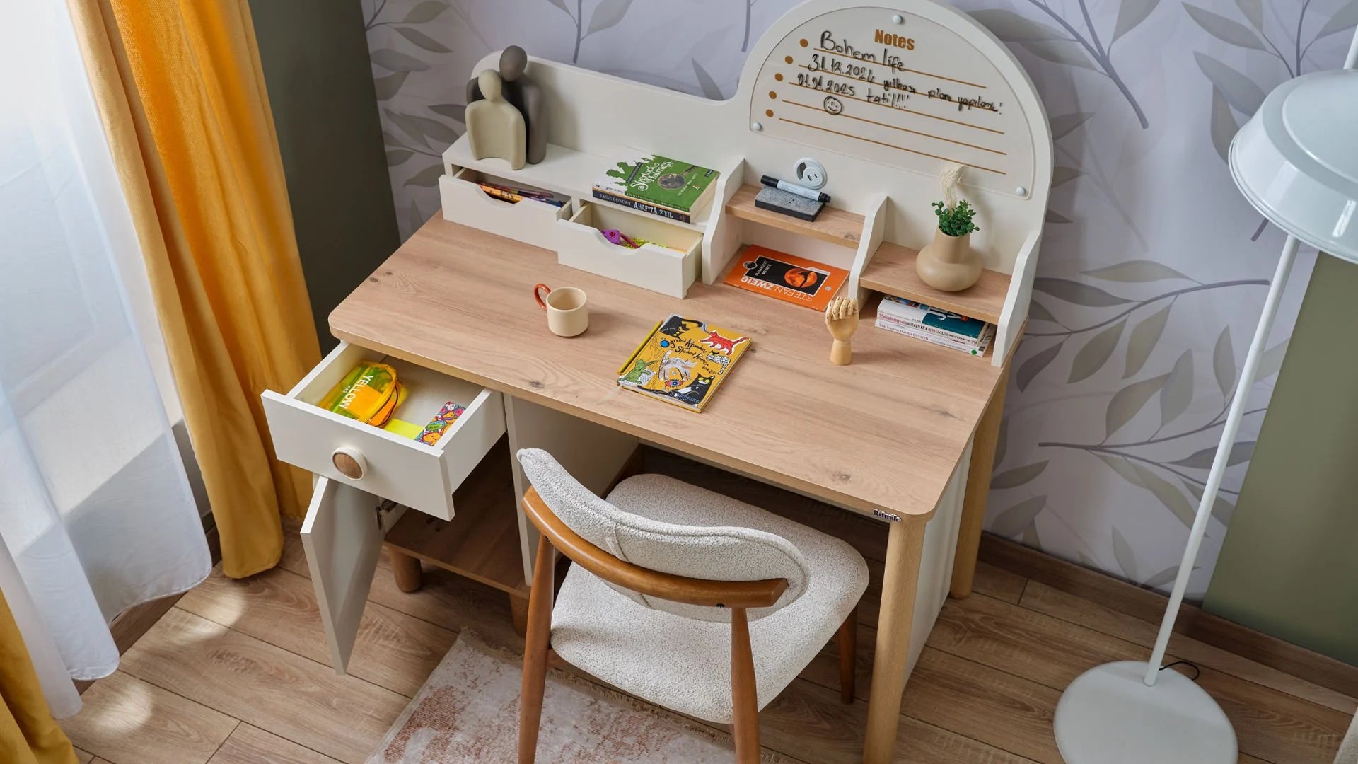 La Scrivania Bohemlife è progettata per offrire un ambiente di studio o lavoro confortevole, sicuro e altamente funzionale. Realizzata in pannello truciolare nobilitato melaminico, garantisce un'elevata resistenza all'acqua e all'umidità. È prodotta nel pieno rispetto dei criteri di salute umana, assicurando un ambiente privo di sostanze cancerogene.