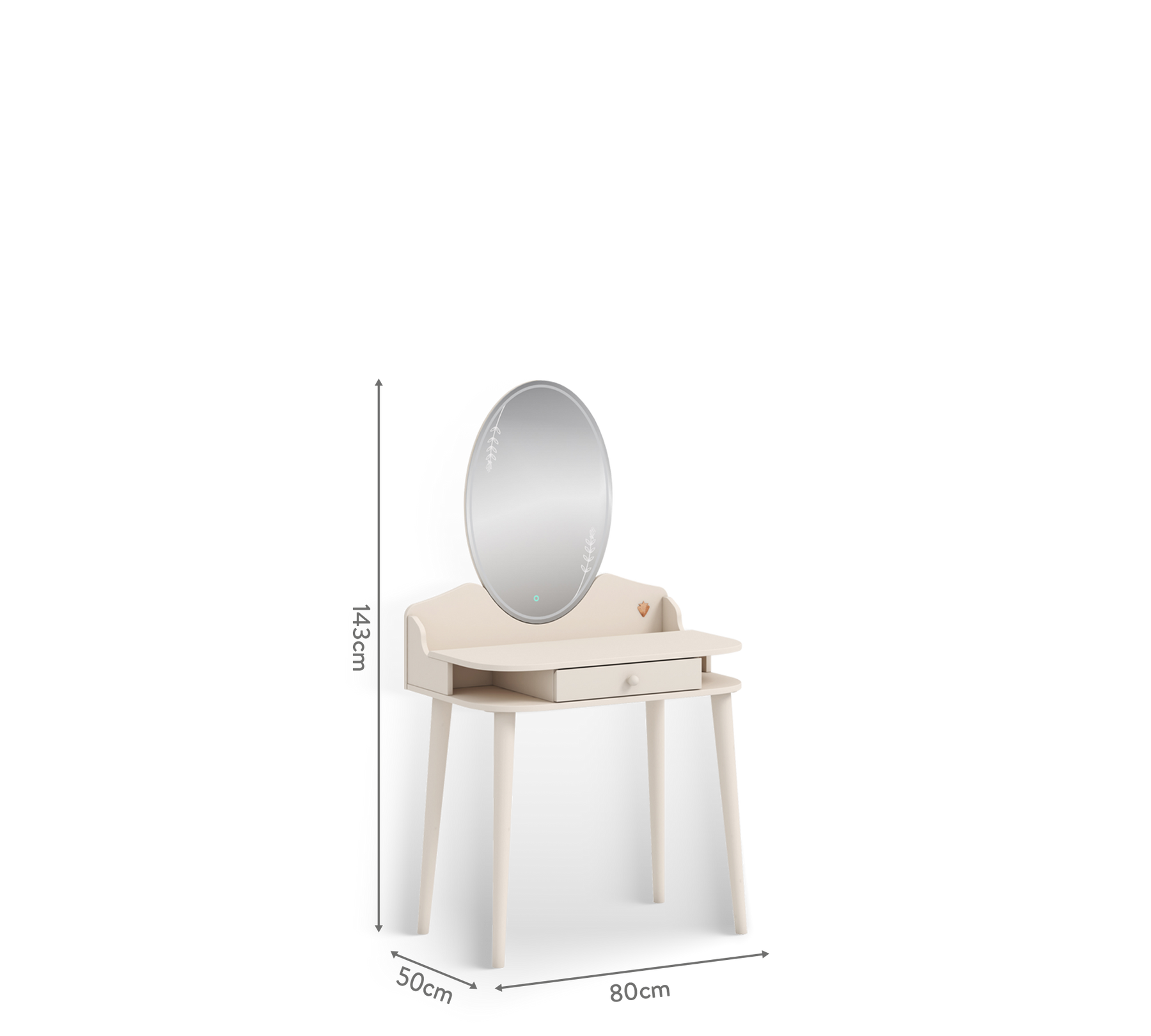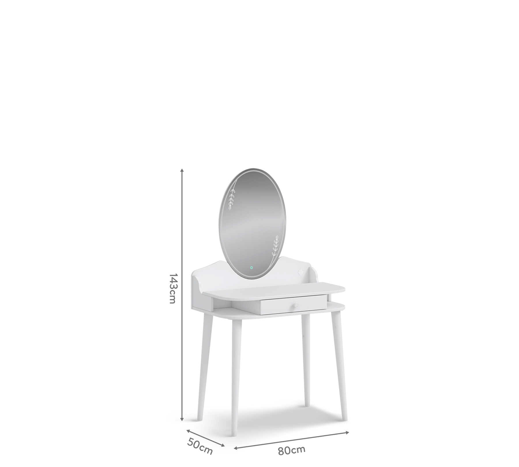 Lo specchio con illuminazione LED touch a forma di fiore e la base con gambe in legno inclinate donano un look moderno e ricercato.
