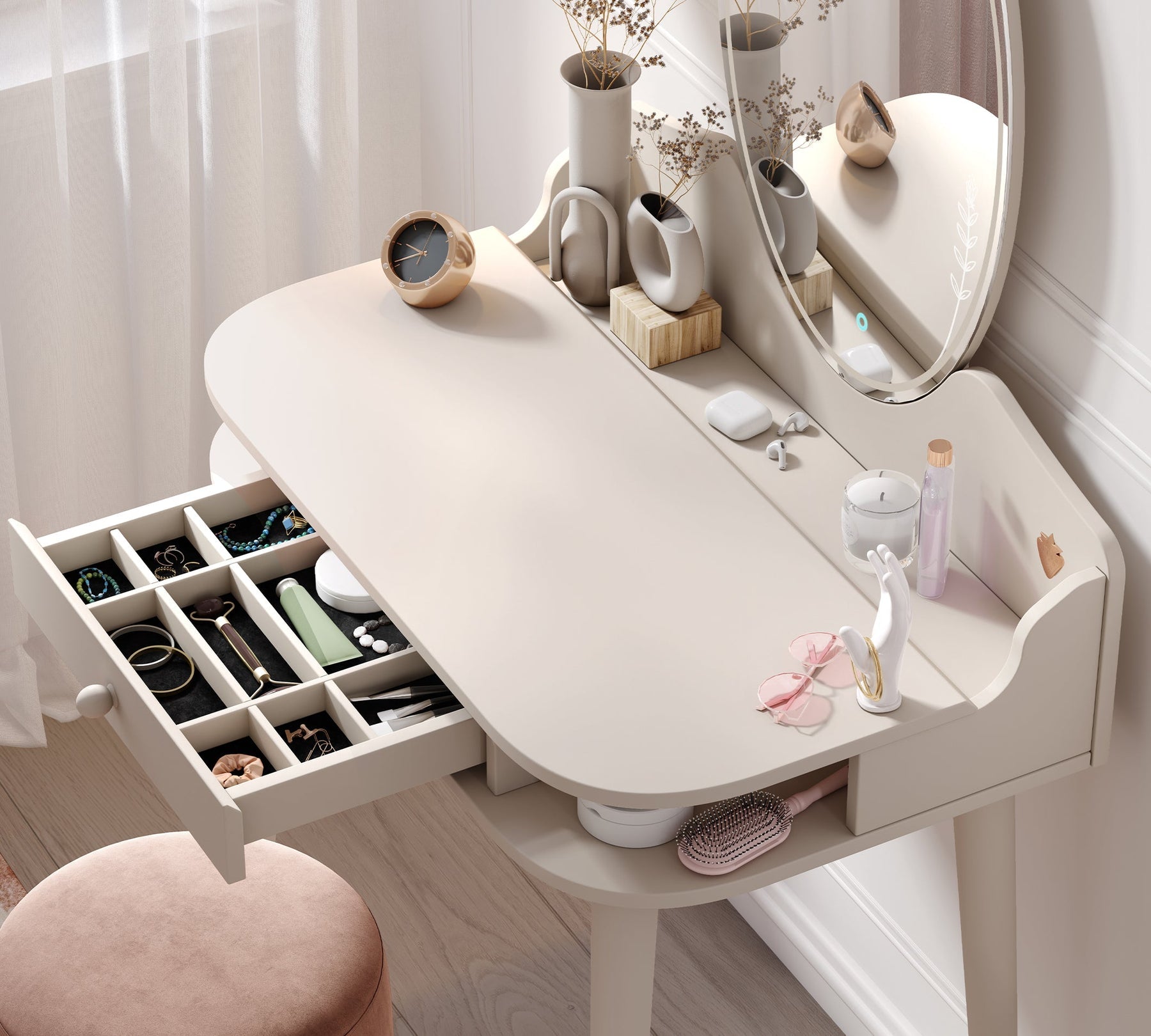 Il Tavolo da Trucco Elegance unisce eleganza e funzionalità per accompagnarti nei tuoi momenti di preparazione quotidiana. Realizzato con materiali di alta qualità e disponibile in colori raffinati, si integra perfettamente in ogni tipo di arredamento.