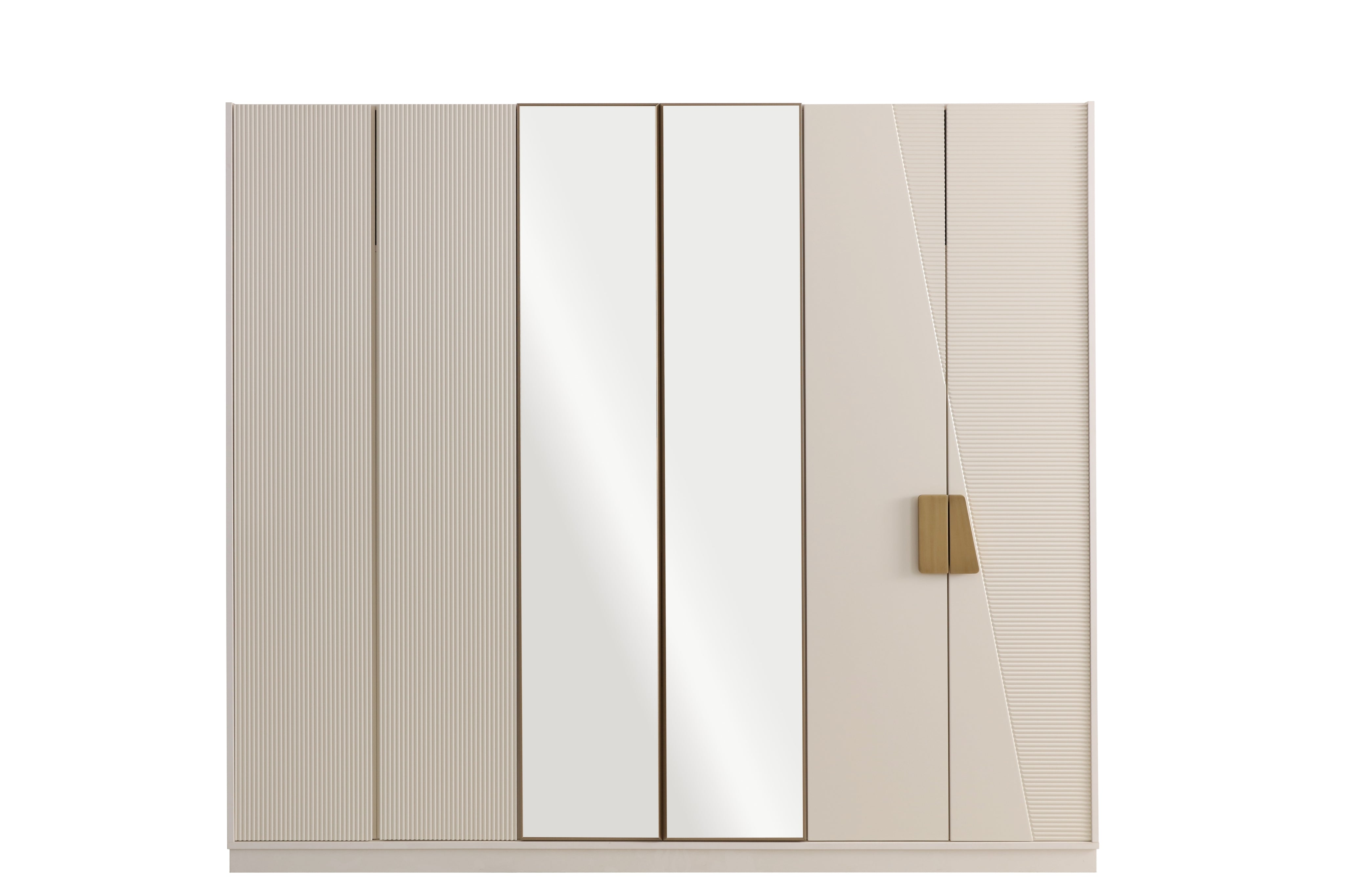 L'armadio a 6 ante Tirilia è la sintesi perfetta tra capacità contenitiva ed eleganza visiva. Le ante frontali si distinguono per la particolare lavorazione a rilievo (effetto canneté) che, abbinata alle maniglie color oro, dona un tocco di lusso contemporaneo alla stanza.