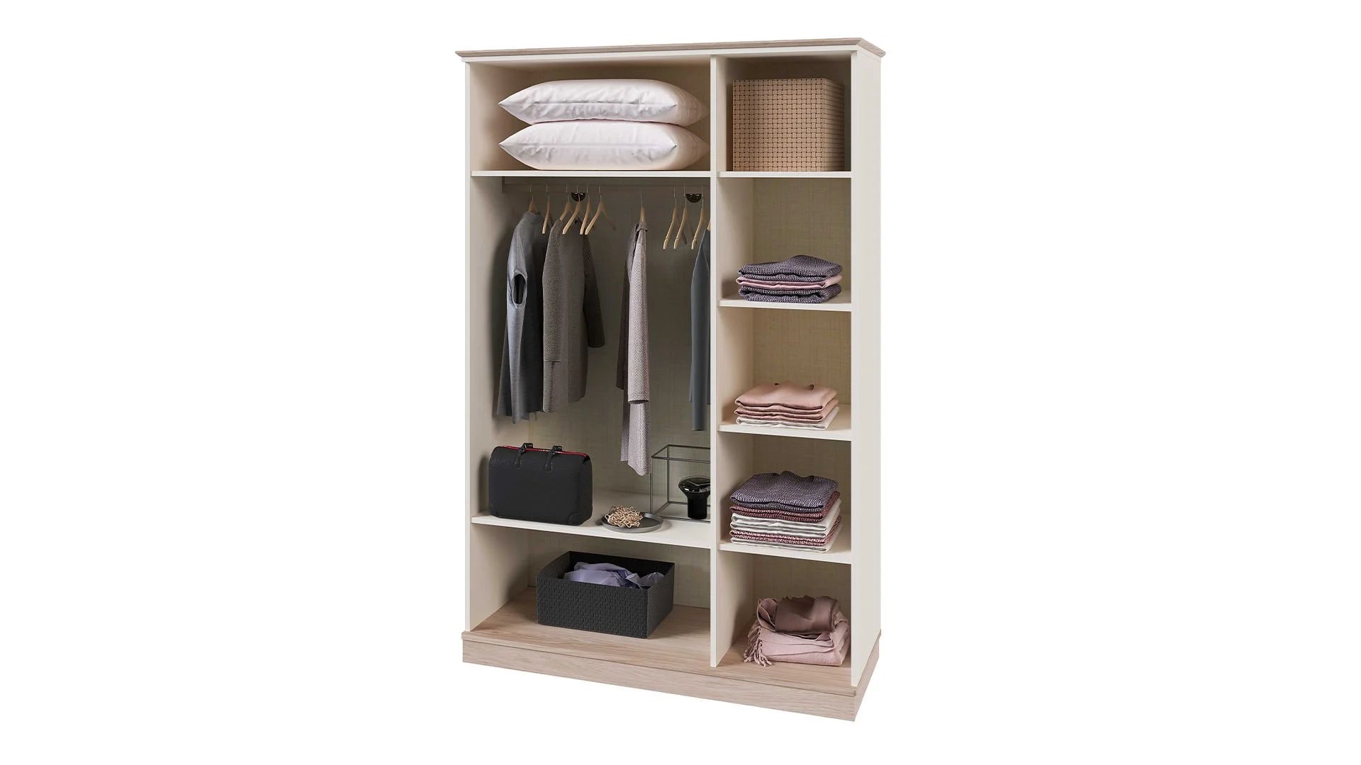 - Vano Sinistro (Appendiabiti): Larghezza interna di 85,7 cm, ottimizzato con un ampio spazio per appendere i vestiti (altezza 118,4 cm) e ripiani superiore e inferiore (altezza 37,7 cm ciascuno).