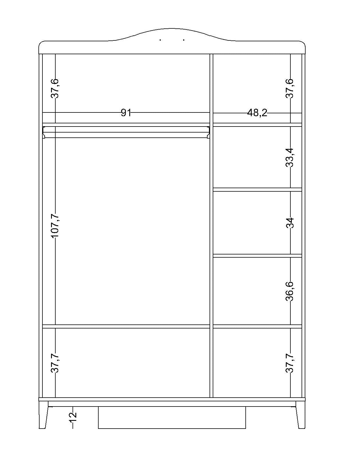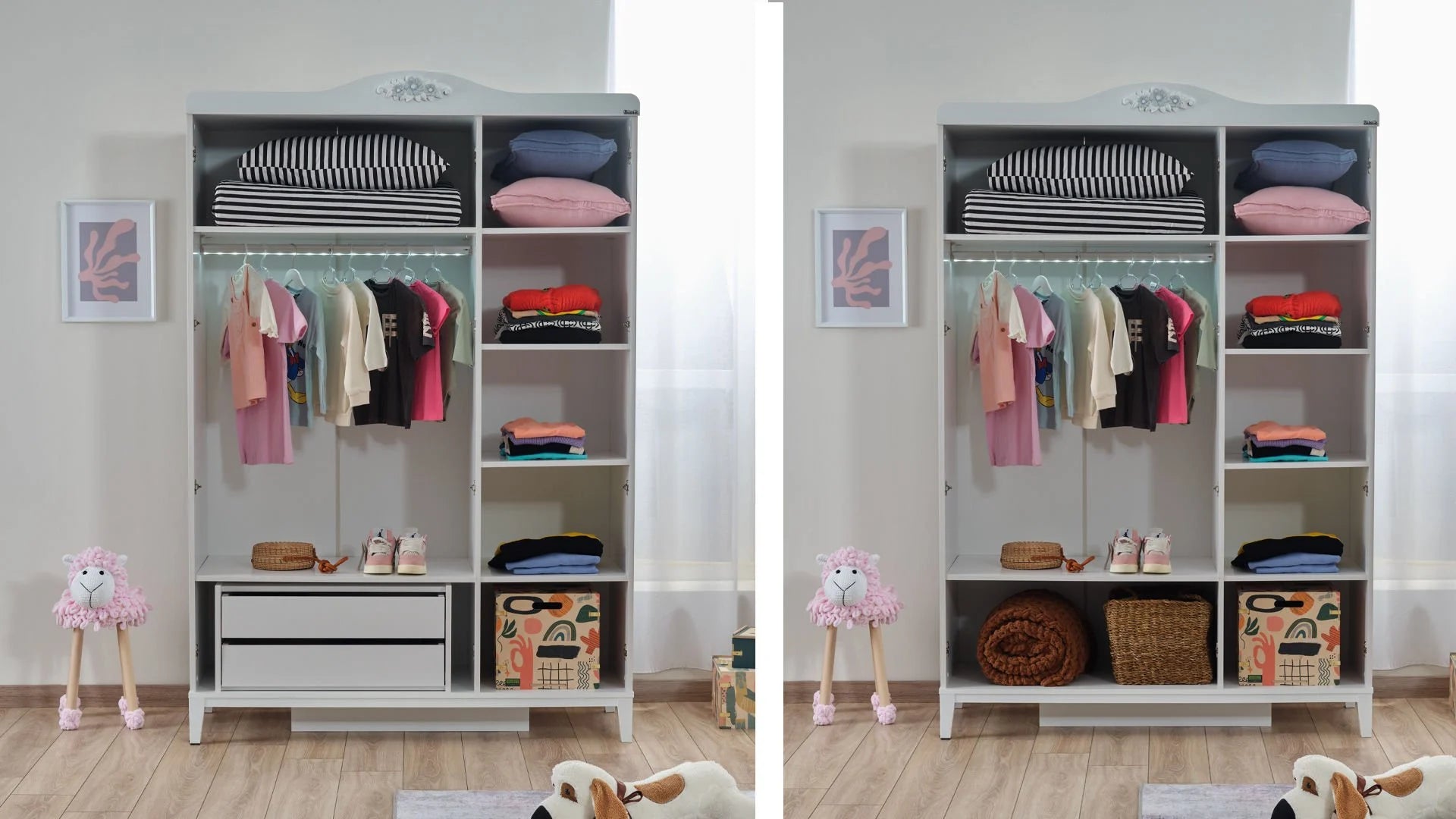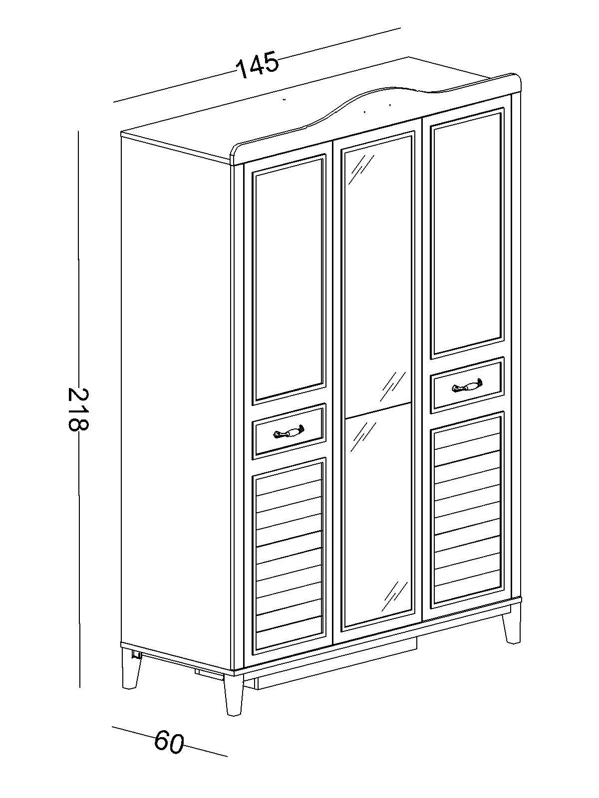 - Specchio e Cassetti Esterni: L'anta centrale è dotata di un ampio specchio a figura intera che dona profondità e luce alla stanza. Inoltre, la base dell'armadio include 2 pratici cassetti esterni, perfetti per riporre biancheria o piccoli accessori.