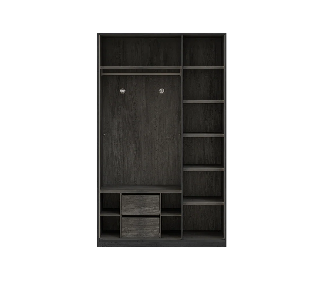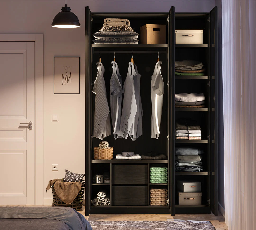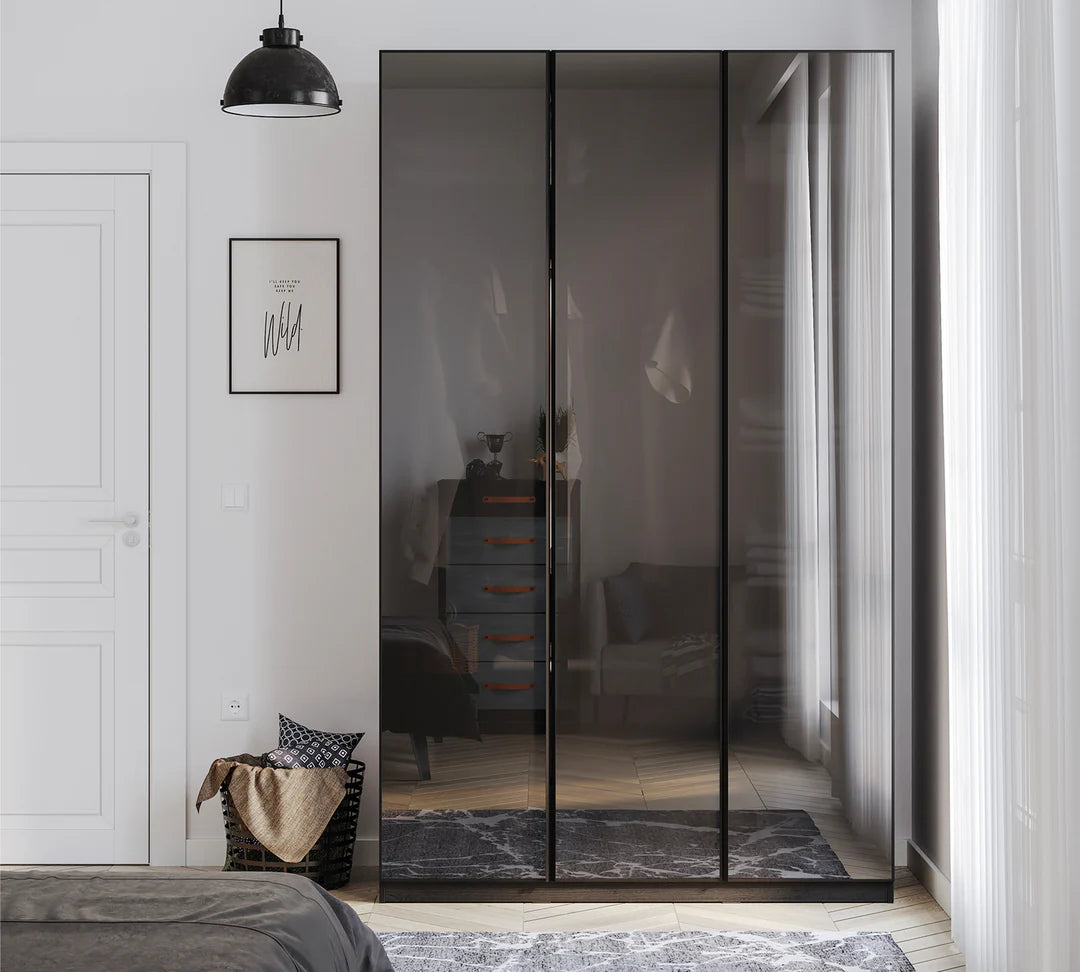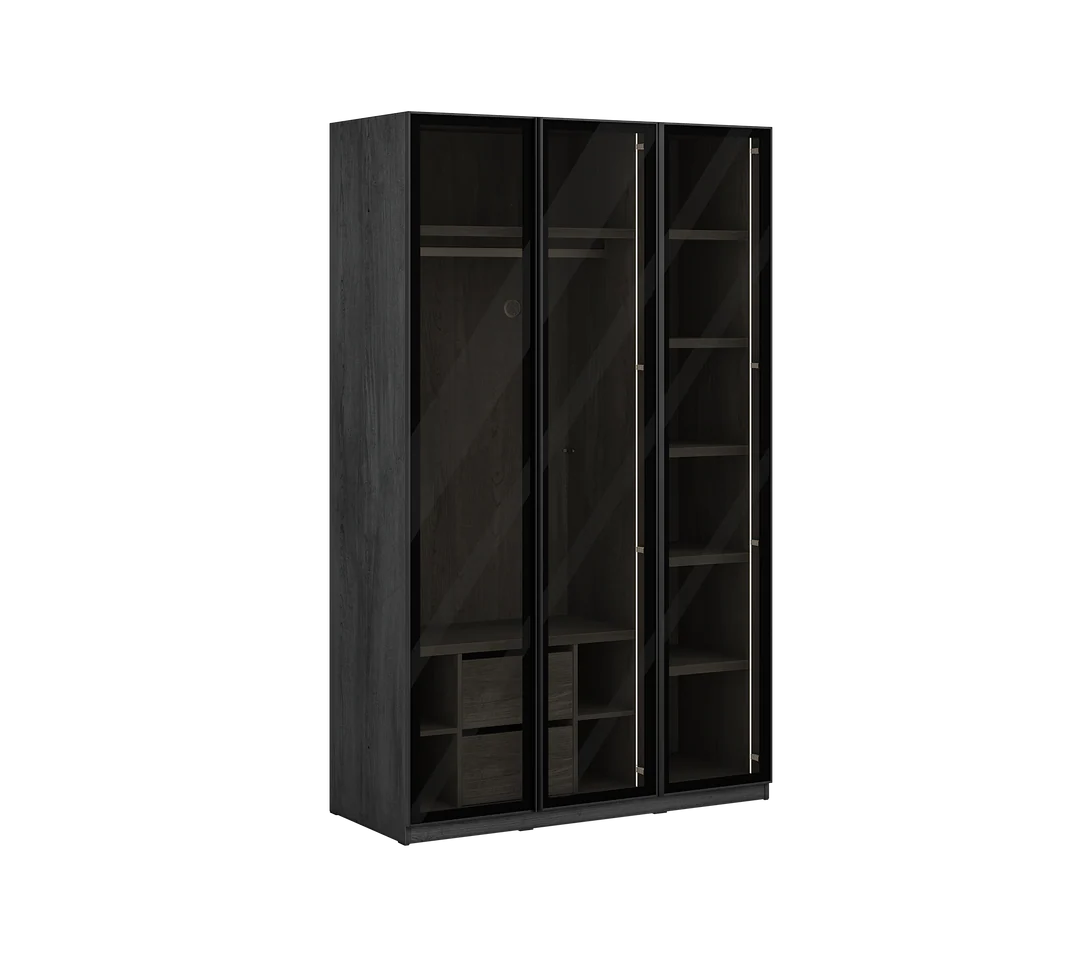L'armadio a tre ante con ante in vetro è la scelta perfetta per chi ha bisogno di molto spazio. Il design interno, messo in risalto dall'illuminazione a LED, si combina con le ante in vetro temperato per conferire alla stanza un'atmosfera sofisticata. Grazie ai ripiani, ai cassetti e alle guide tandem, potrai riporre i tuoi oggetti in modo ordinato ed elegante.