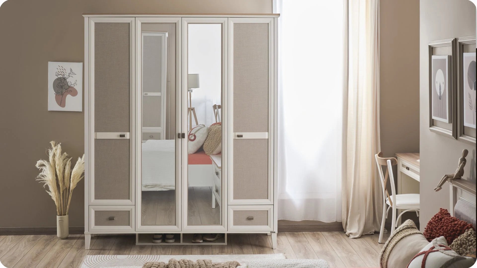 L'Armadio a 4 Ante Orion con Specchi è la massima espressione di eleganza e funzionalità per la cameretta. Questa versione arricchisce il design premium della collezione con due ampi specchi centrali, perfetti per donare profondità e luminosità all'ambiente, oltre a essere utilissimi per prepararsi ogni giorno. Realizzato in pannello truciolare nobilitato melaminico di altissima qualità e profili in MDF, garantisce un'eccellente resistenza all'umidità ed è prodotto nel totale rispetto della salute (completamente privo di sostanze cancerogene e nocive).