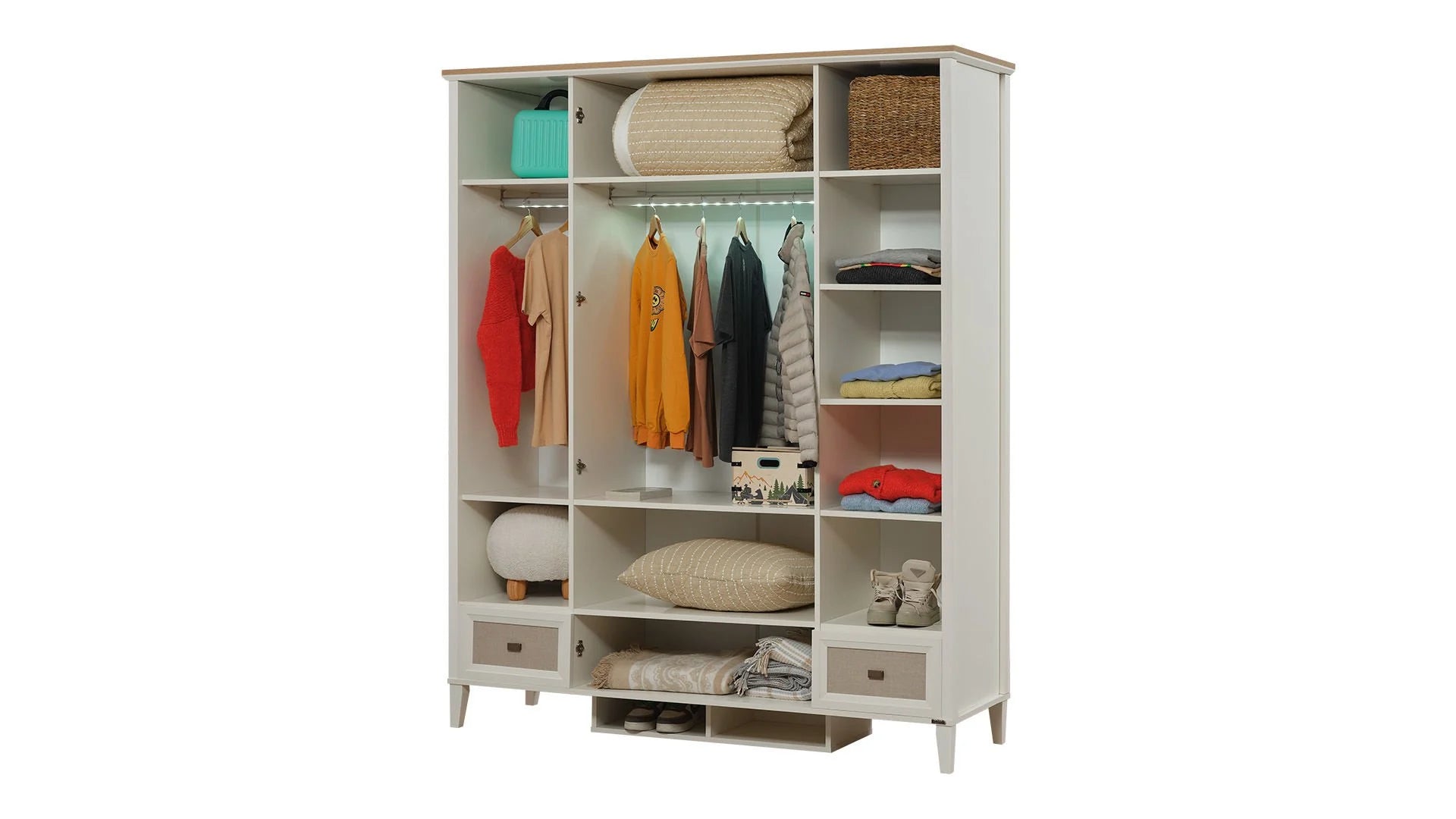 - Maxi Organizzazione Interna: L'interno (profondità utile 49 cm) è suddiviso in tre sezioni. Al centro (larga 87,3 cm) domina uno spazio con bastone appendiabiti dotato di illuminazione LED. La colonna destra (larga 41,6 cm) offre 5 capienti ripiani, mentre la colonna sinistra (larga 41,6 cm) unisce ulteriori ripiani a un secondo appendiabiti.