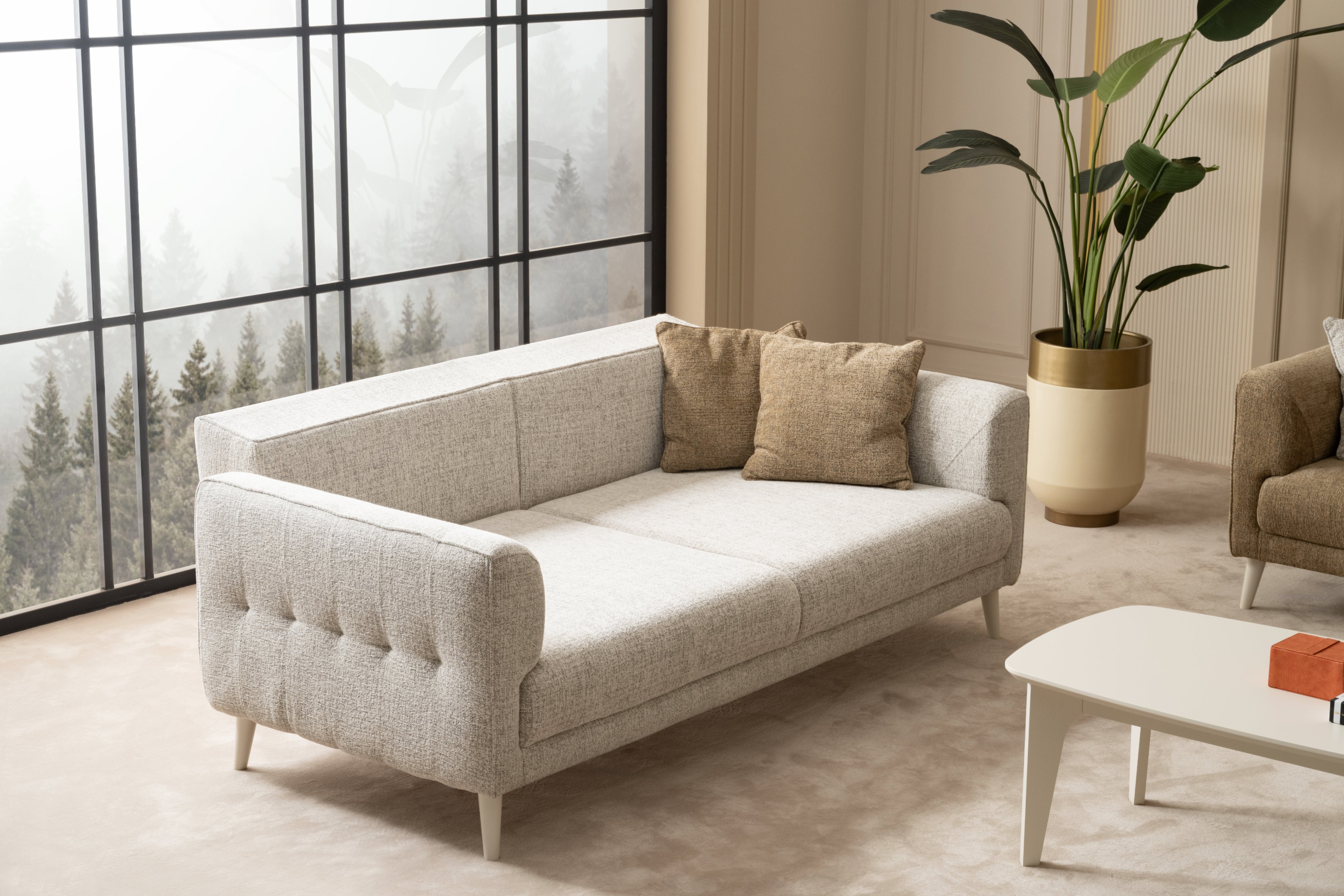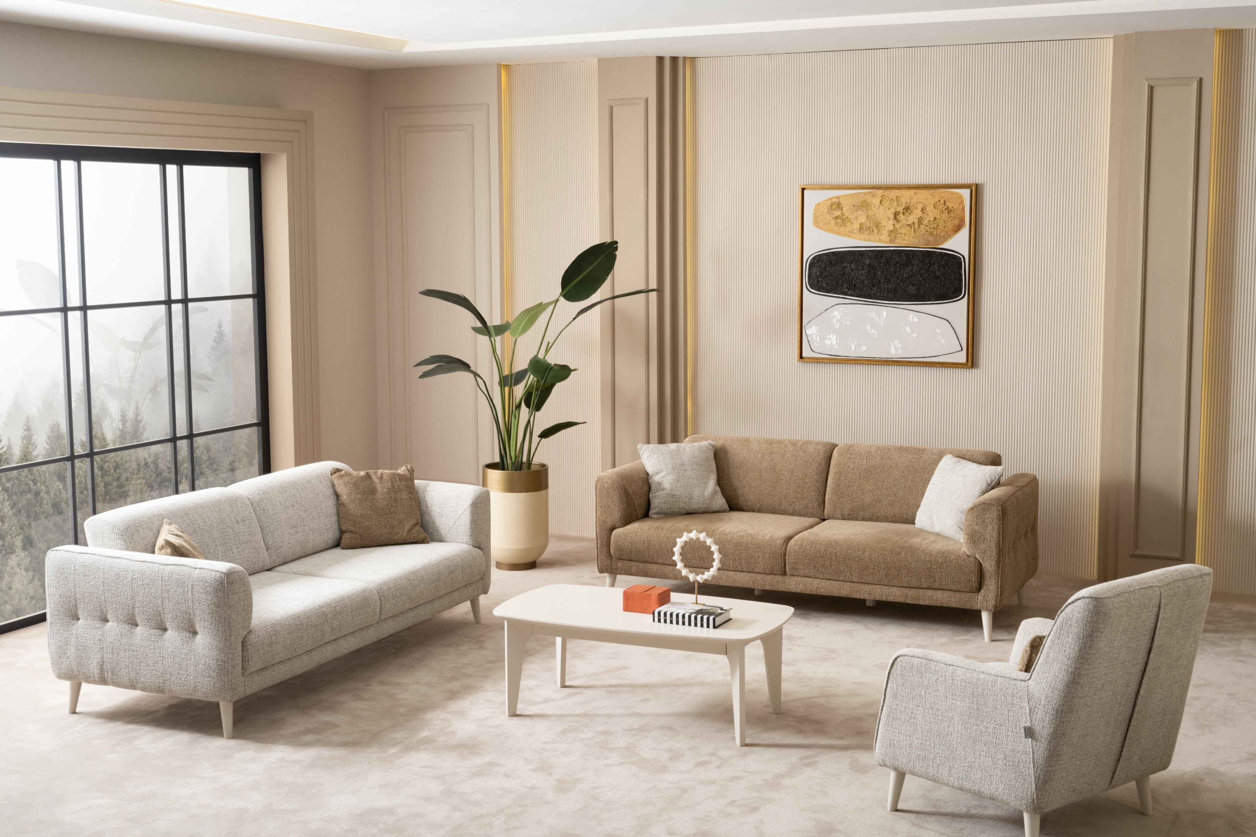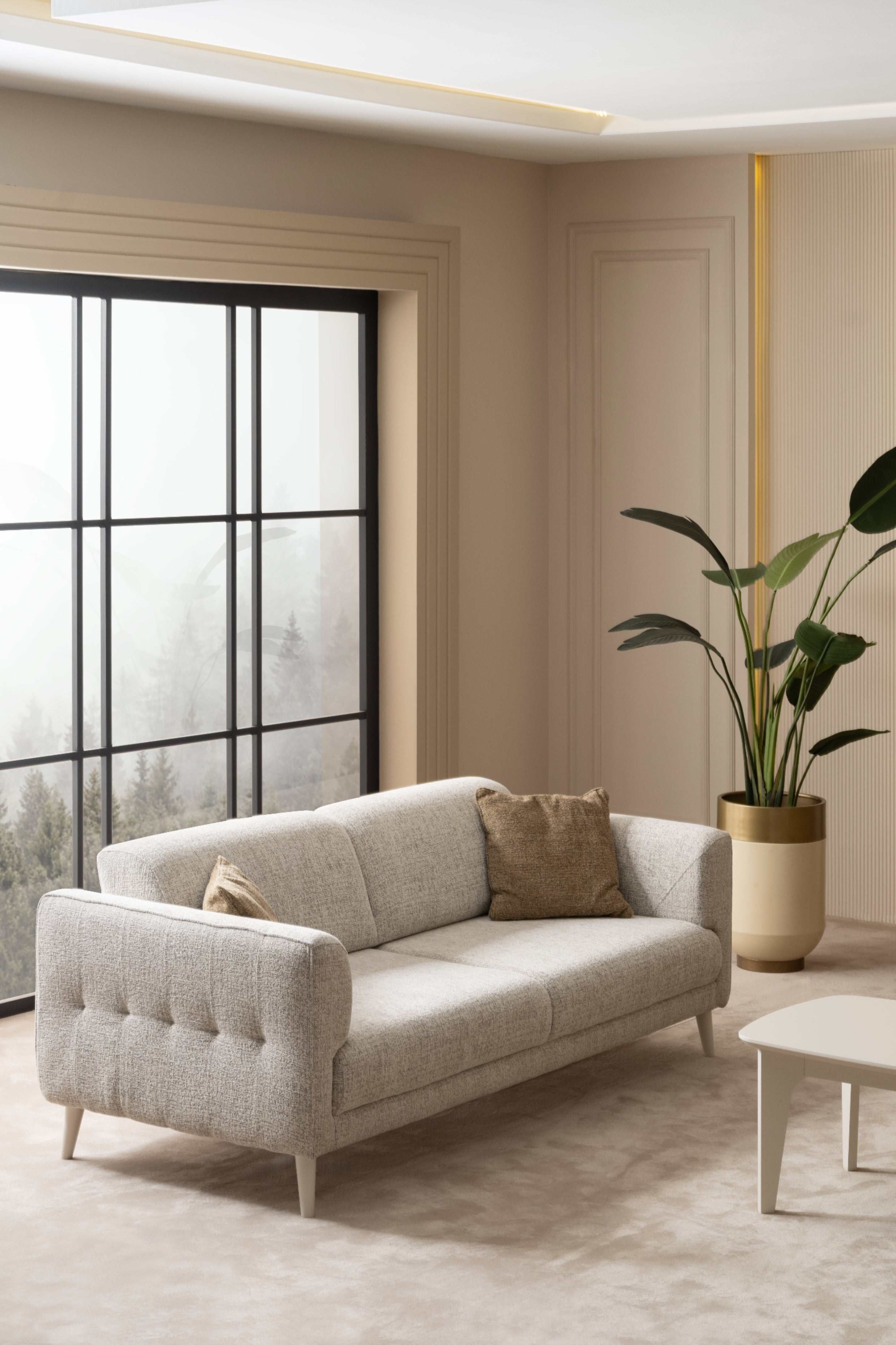 I dettagli laterali con bottoni decorativi sui braccioli e i piedini alti conferiscono leggerezza a questo imponente set, mentre il tavolino centrale completa la funzionalità della zona giorno, offrendo un piano d'appoggio pratico ed elegante.