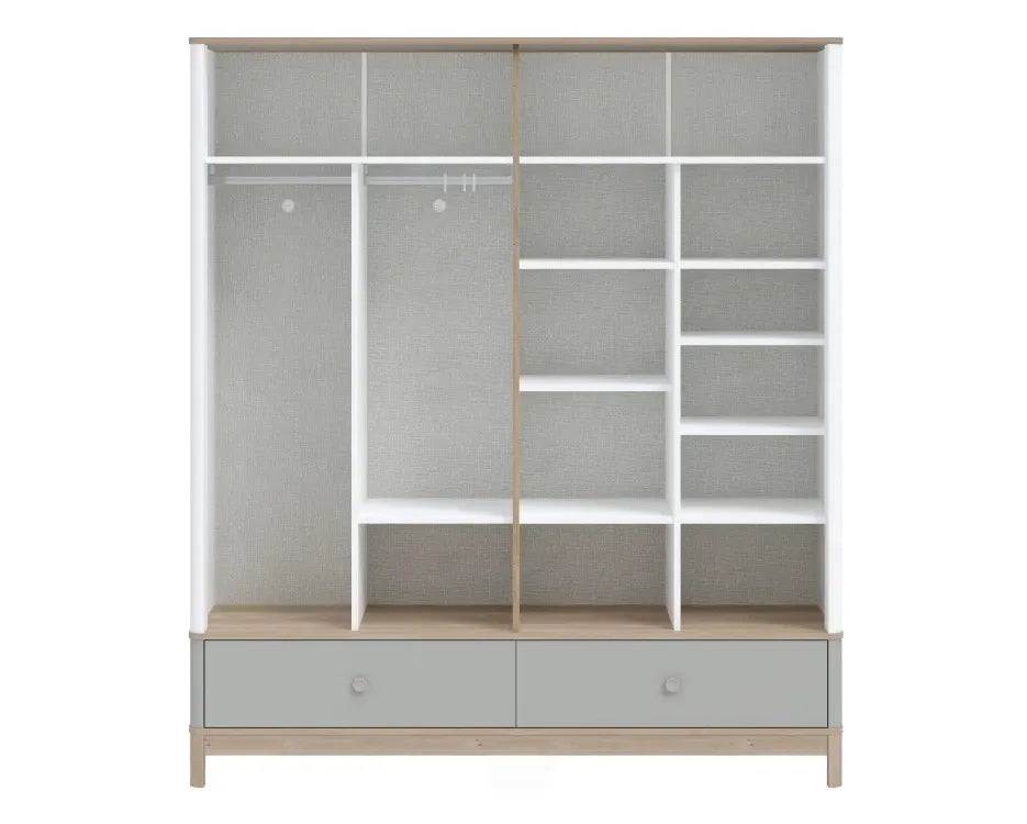 Il Bono Grey Armadio a 4 Ante è una soluzione elegante e funzionale per la cameretta dei bambini e dei ragazzi. Il suo design moderno, dai toni neutri grigio e bianco, si integra perfettamente negli ambienti contemporanei, garantendo ampio spazio di archiviazione e massima praticità.