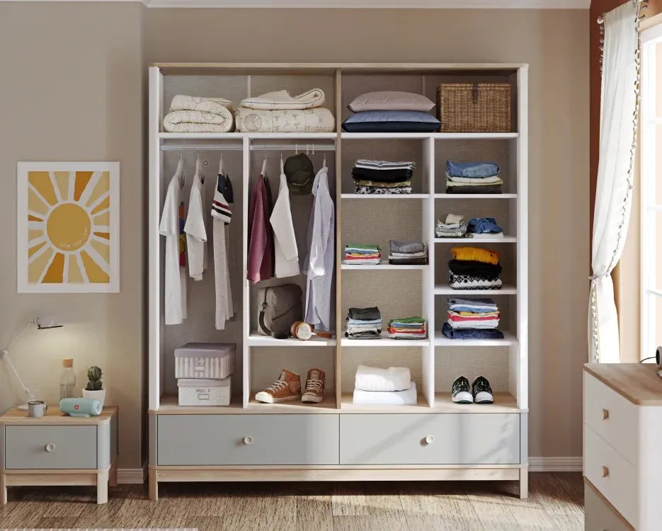 L’armadio è progettato per accompagnare la crescita del bambino, offrendo una disposizione interna studiata per mantenere ordine e facilità di accesso. La combinazione di vani appendiabiti e ripiani consente di organizzare vestiti, biancheria e accessori in modo efficiente.