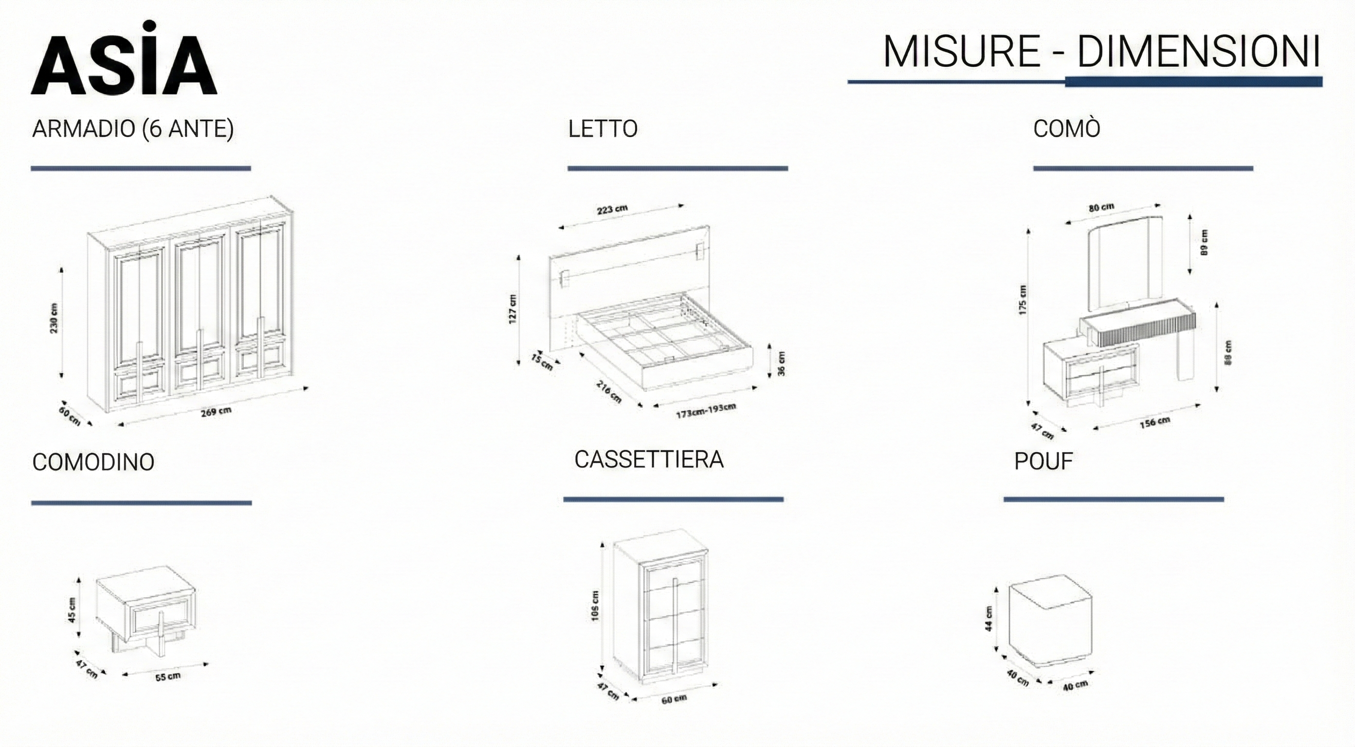 | Comodino (x2) | 55 cm | 47 cm | 45 cm |