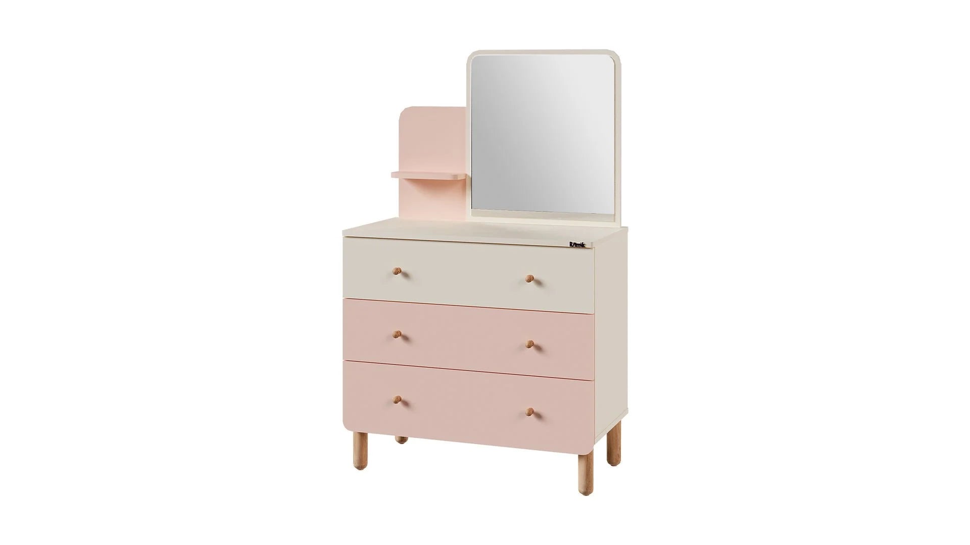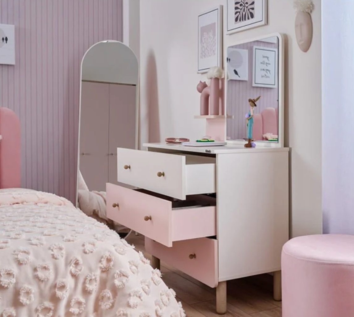 • Archiviazione Organizzata: Dispone di 3 ampi e profondi cassetti. Il cassetto superiore, in delicato color crema, si abbina perfettamente ai due inferiori in rosa pastello, creando un'armonia visiva unica.