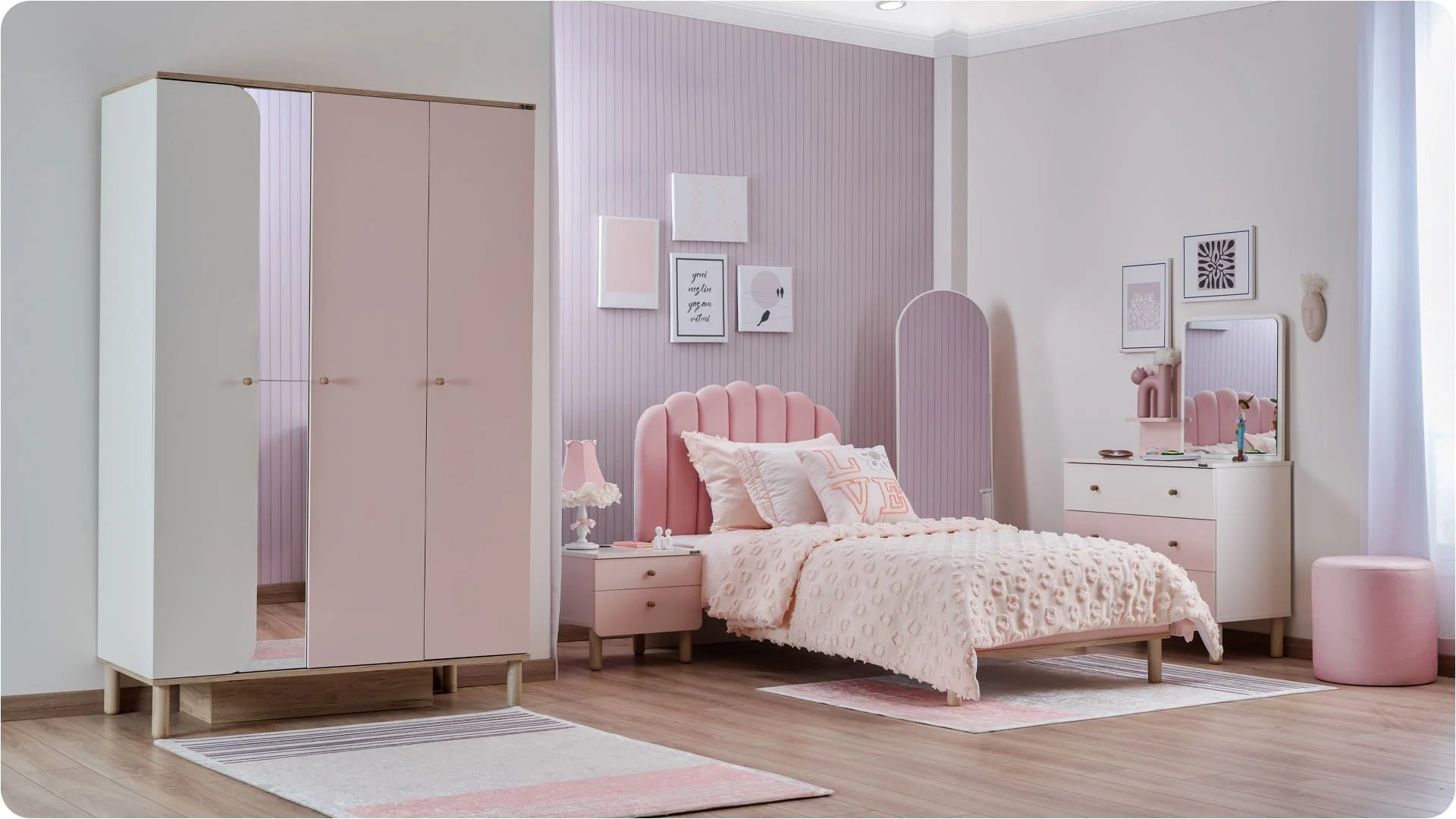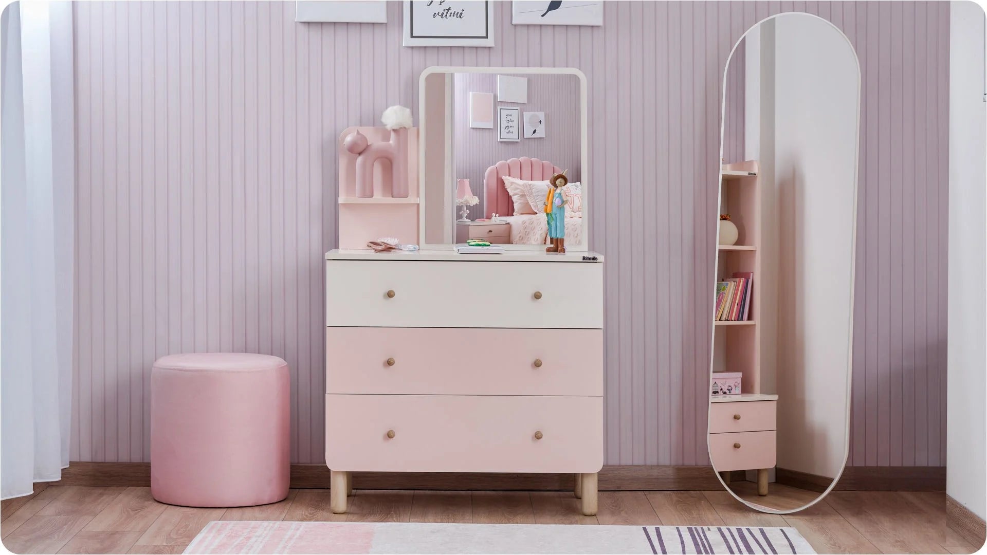 • Specchio e Angolo Beauty: La parte superiore è dotata di uno splendido specchio integrato, affiancato da un delizioso pannello rosa con una piccola mensola, ideale per appoggiare spazzole, piccoli profumi o decorazioni.
