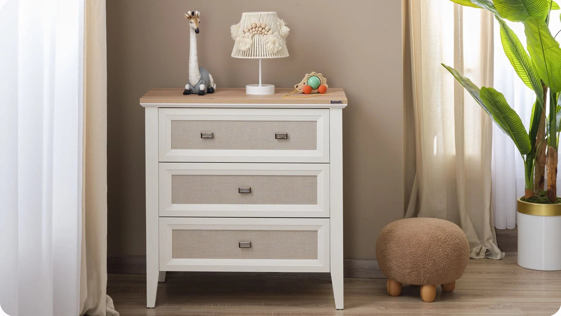 • Sicurezza Completa: Gli angoli e i bordi della cassettiera sono dolcemente arrotondati per proteggere i bambini da urti accidentali. Inoltre, la confezione include una staffa di fissaggio a parete, un accessorio fondamentale per prevenire ogni rischio di ribaltamento.