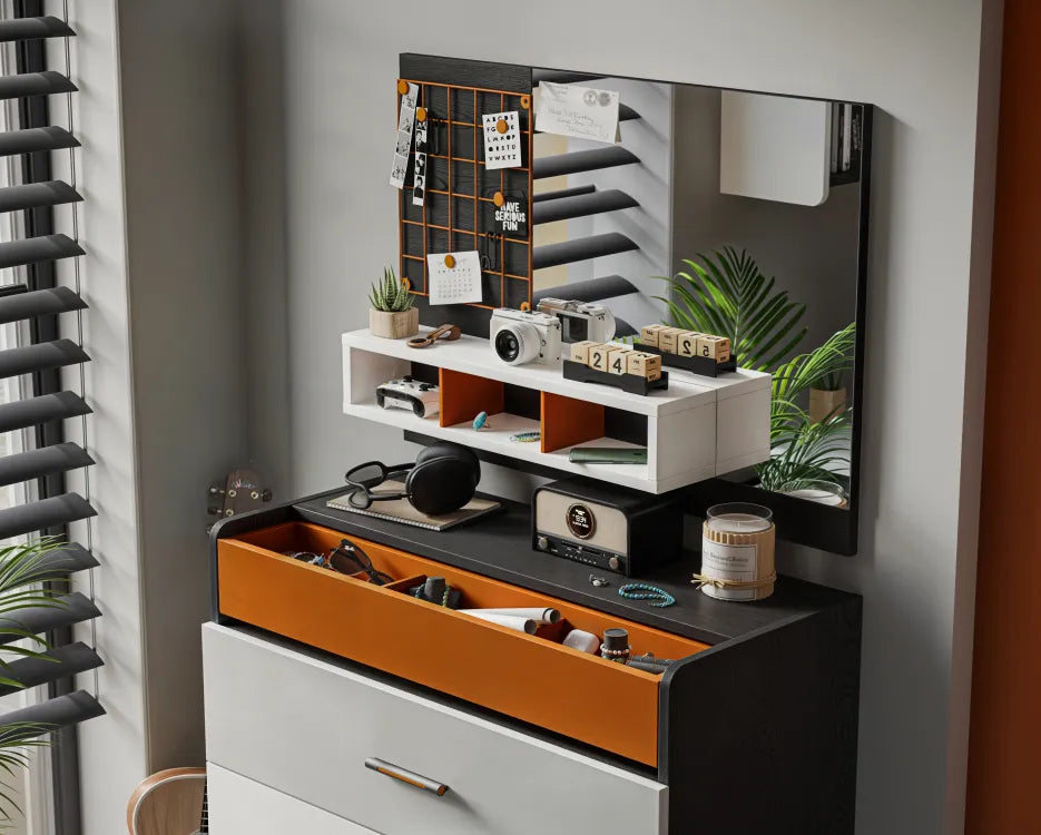 Il comò Trend con specchio di Donnes Home unisce funzionalità e design contemporaneo in un unico elemento d’arredo. Il contrasto tra superfici chiare e scure, valorizzato dal dettaglio cromatico superiore, rende questo comò ideale per camere da letto moderne e ambienti giovani.
