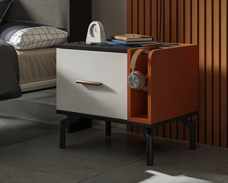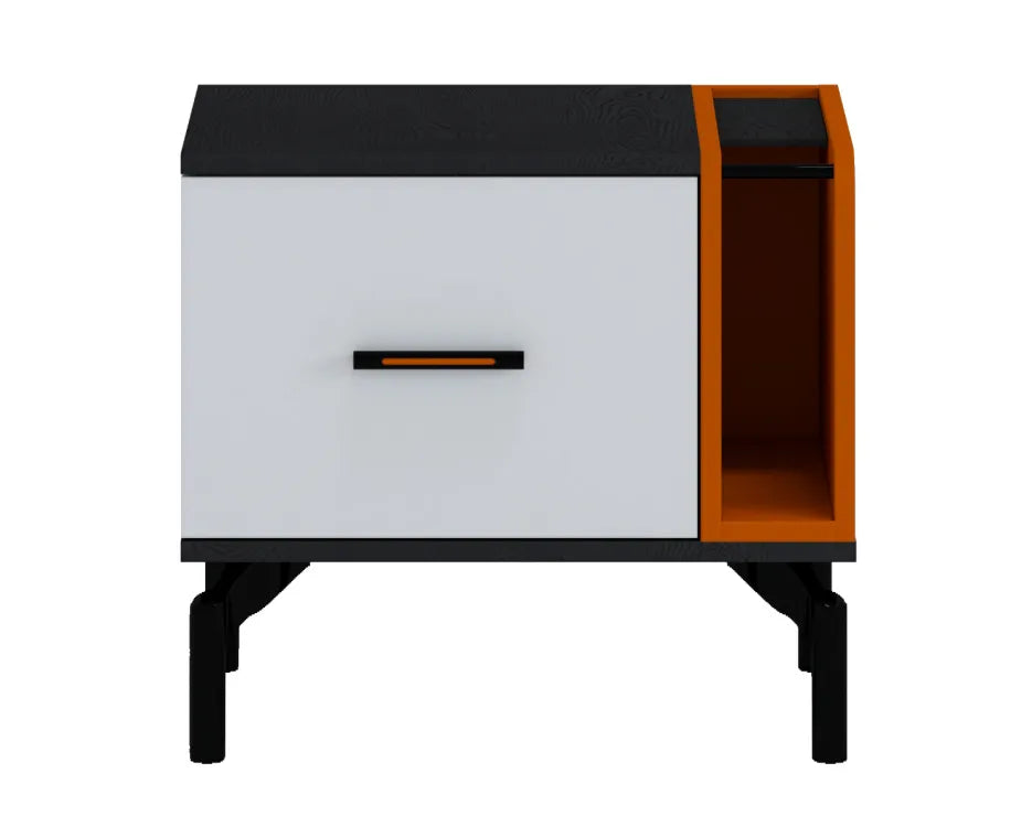 Dotato di un cassetto capiente e di un vano laterale aperto, il comodino Trend offre una soluzione pratica per riporre oggetti di uso quotidiano, libri o accessori, mantenendo ordine e funzionalità accanto al letto. La struttura rialzata su piedini garantisce leggerezza visiva e facilità di pulizia.