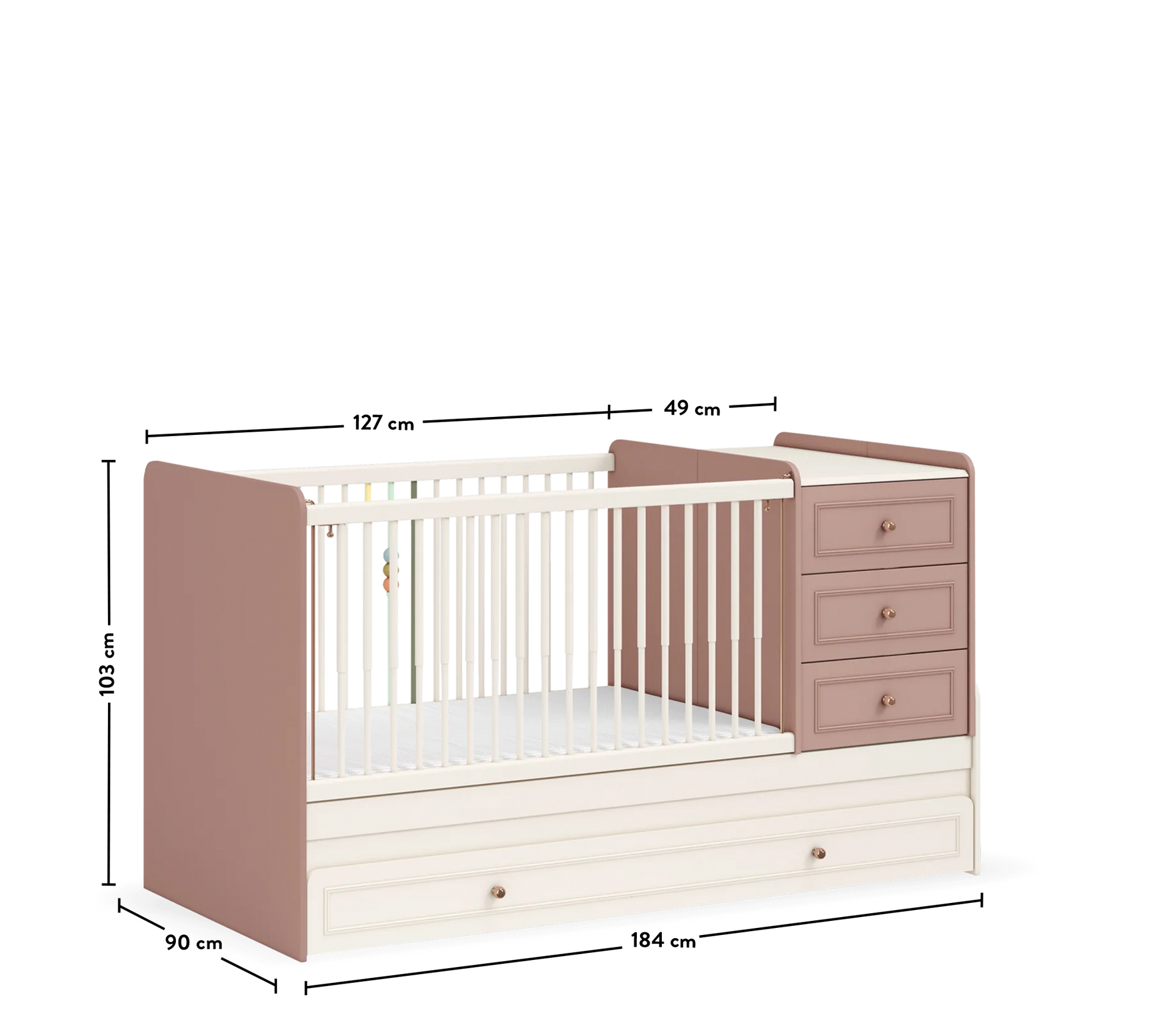 - Moduli Indipendenti (Fasciatoio e Comodino): Durante la fase neonatale, l'estremità del letto ospita una comoda cassettiera con ripiani, perfetta come fasciatoio e per riporre i pannolini. Al momento della trasformazione, questo modulo si separa dal letto diventando un elegante comodino/cassettiera indipendente per la cameretta.