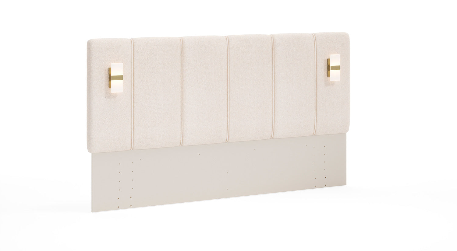 La caratteristica distintiva di questo letto è la sua testiera "oversized". [cite_start]Ai lati della testiera sono integrate due applique a LED che emettono una luce calda e accogliente. Perfette per leggere un libro la sera o per creare un'atmosfera intima senza bisogno di lampade aggiuntive sul comodino.
