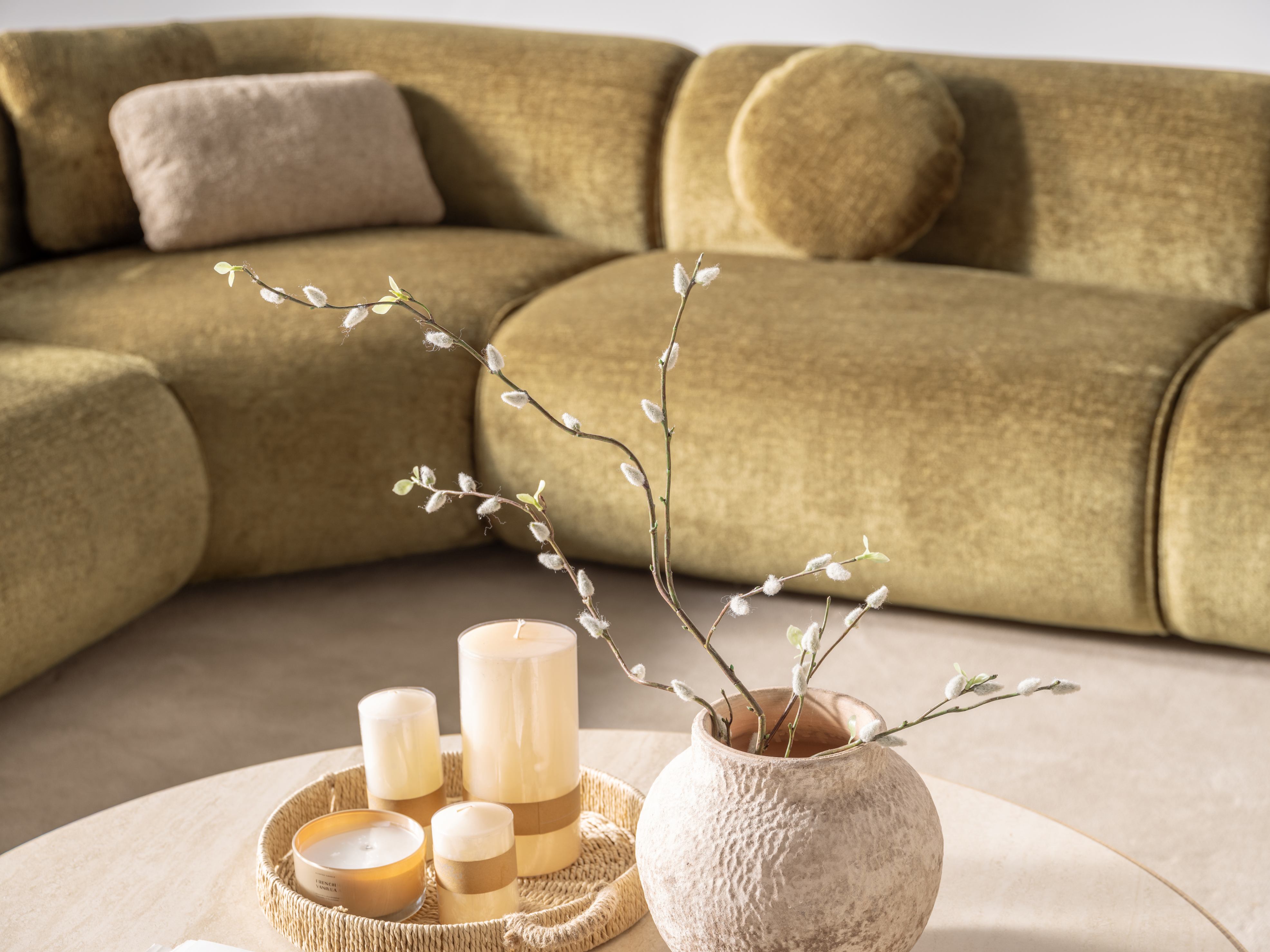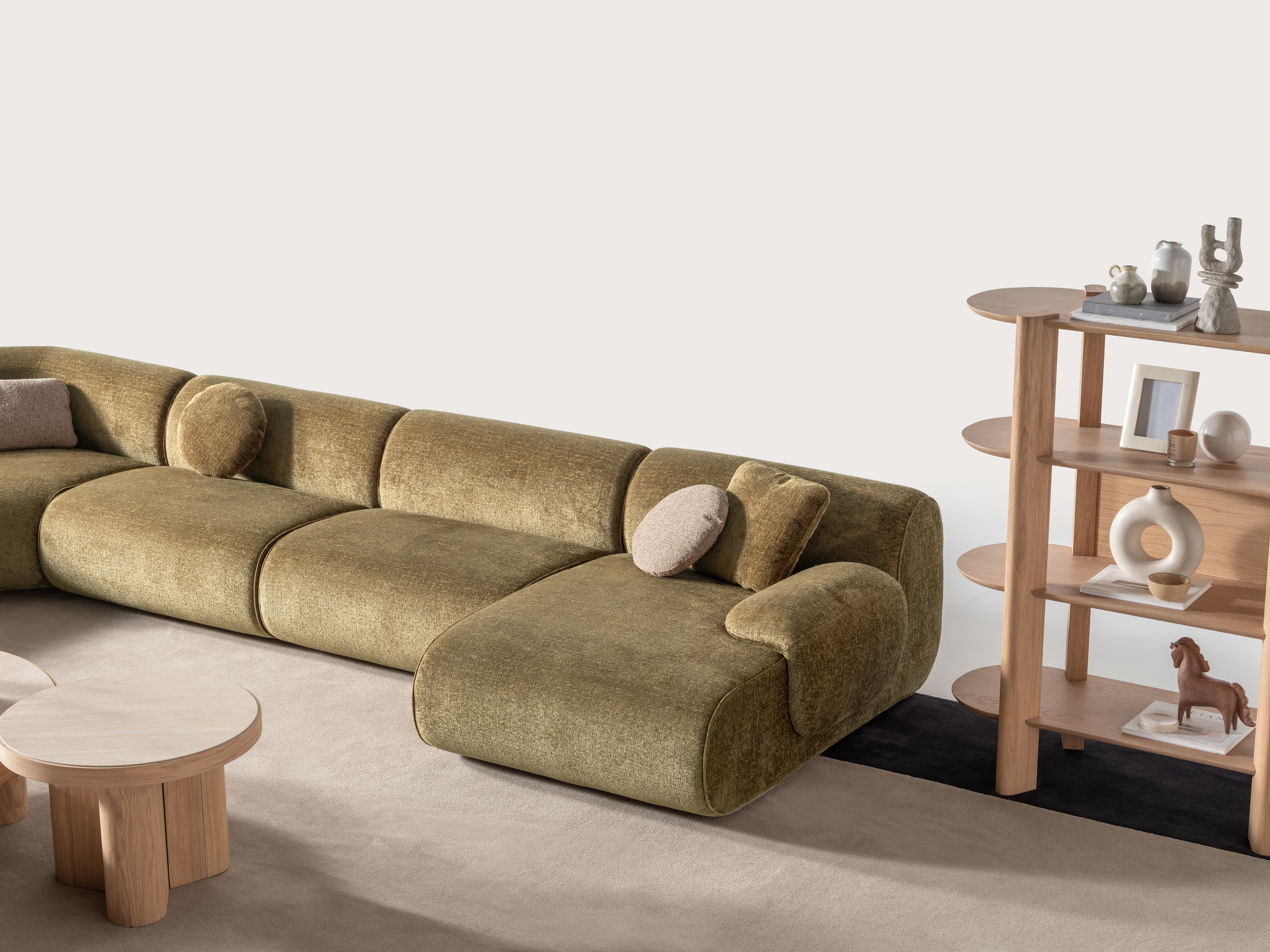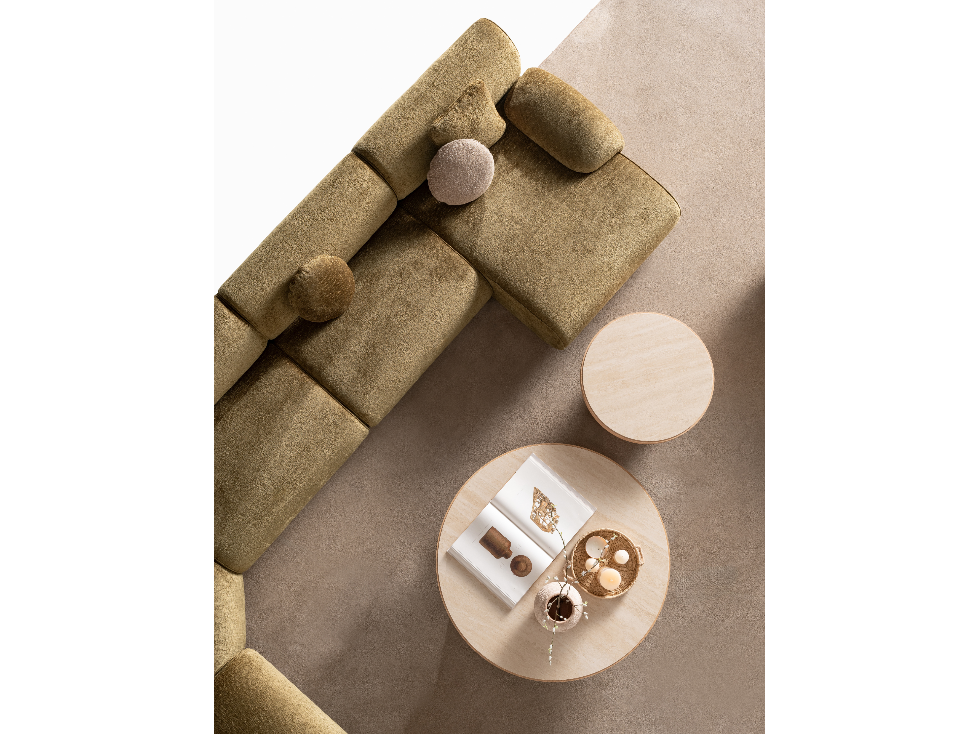 Ogni modulo può essere utilizzato singolarmente o abbinato ad altri elementi per formare configurazioni lineari, angolari o curve. La struttura imbottita assicura un comfort profondo, mentre i cuscini e i dettagli arrotondati aggiungono un tocco di naturale eleganza.