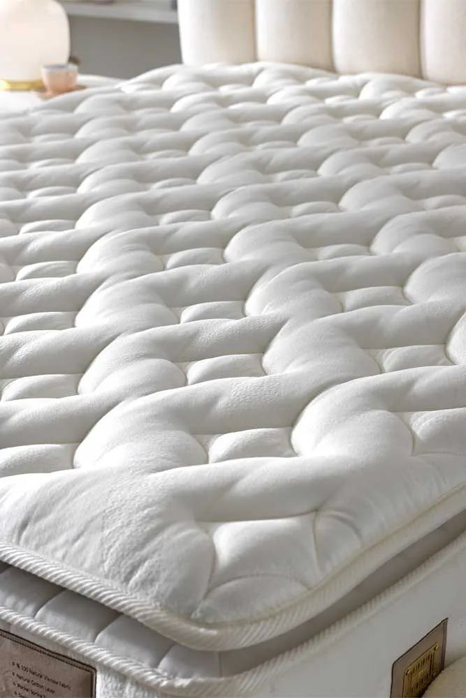 - Cotone Naturale (Effetto Climatizzato): Lo strato in cotone naturale bilancia la temperatura corporea, assorbendo l'umidità in eccesso e garantendo notti fresche e asciutte.