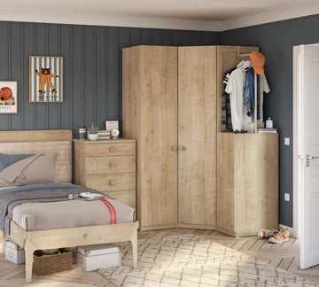 L'armadio angolare Mocha, con il suo design pratico e i suoi dettagli eleganti, crea ordine ed estetica nella vostra camera.