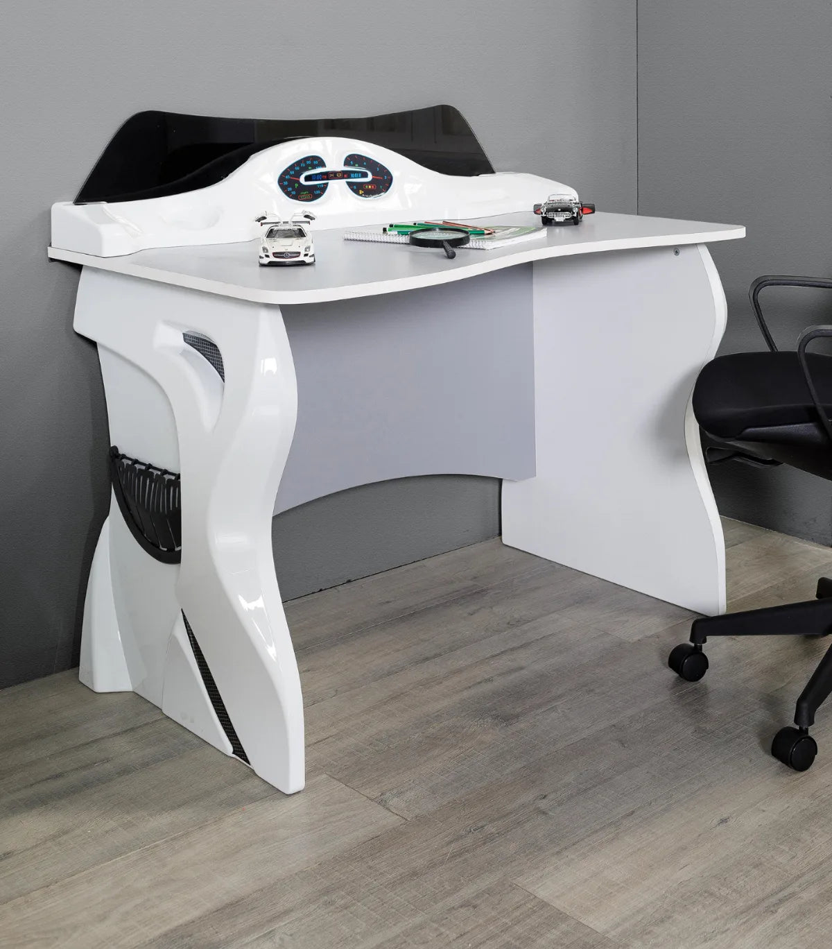 Titi Police è la scrivania della collezione cameretta a tema polizia, con plancia decorativa in ABS bianco lucido e quadranti racing sul pannello posteriore. Il piano di lavoro ampio in pannello melaminico offre tutto lo spazio necessario per studiare e creare.