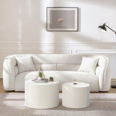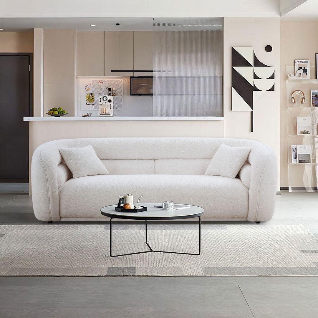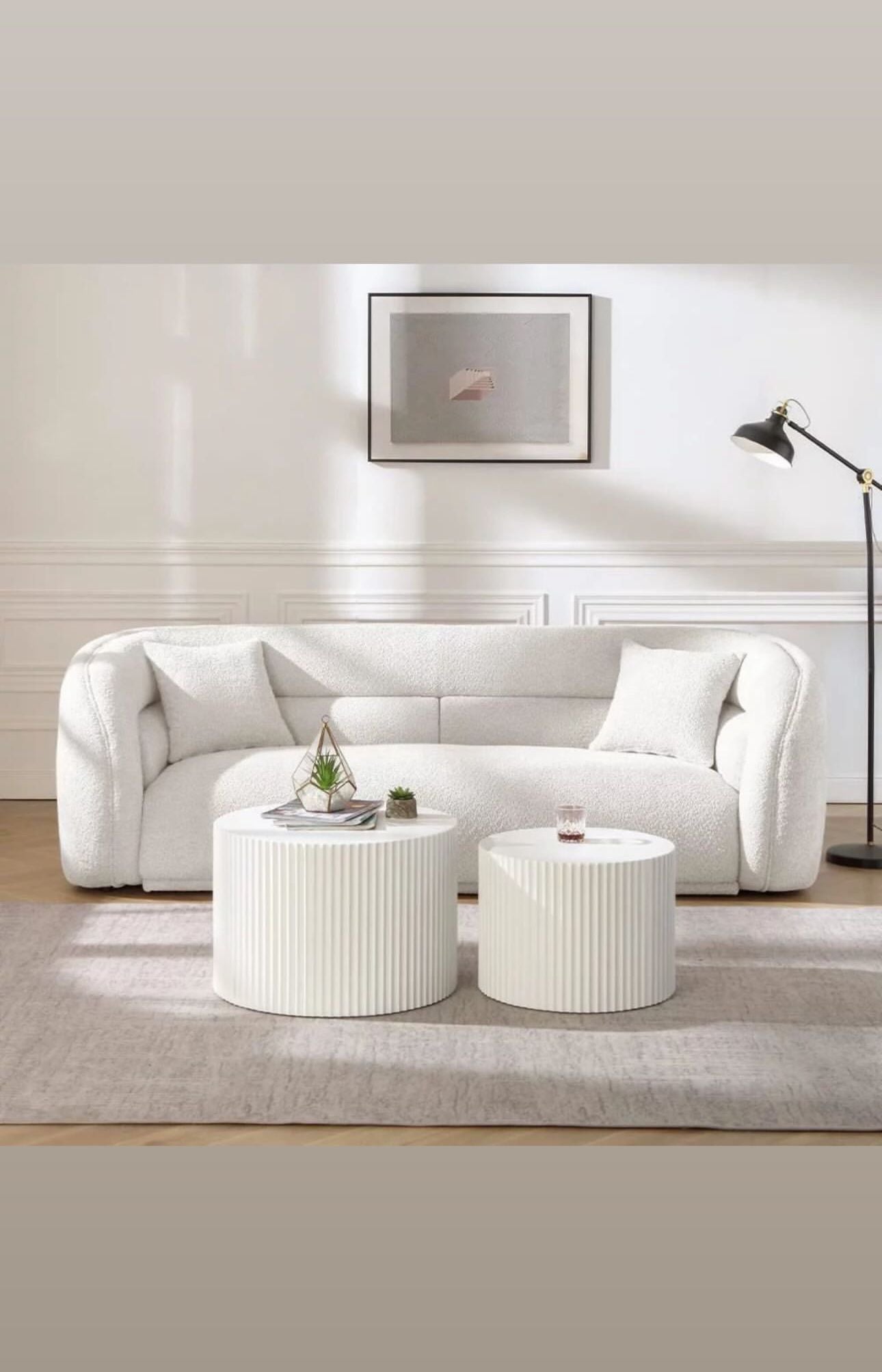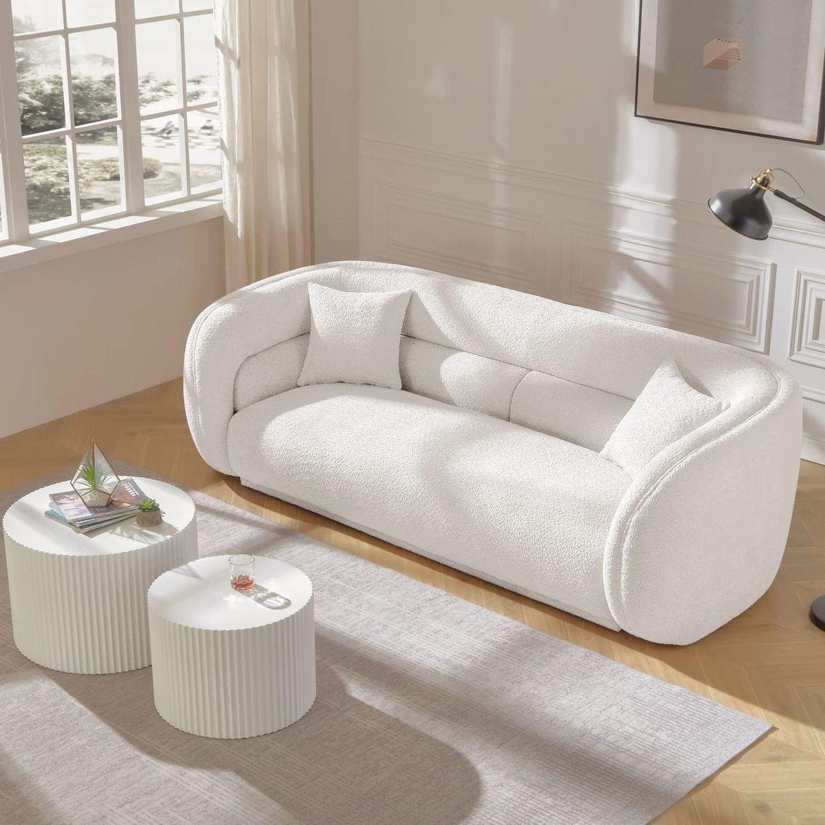 Caratteristiche principali: Rivestimento in tessuto bouclé bianco crema di alta qualità · Silhouette organica con braccioli arrotondati e scocca continua · Seduta generosa e imbottitura densa · Cuscini decorativi coordinati inclusi · Base integrata a profilo basso · Design essenziale e contemporaneo