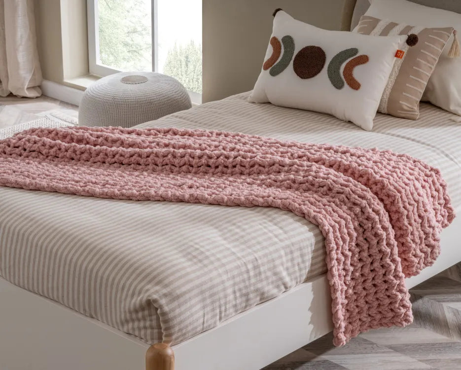 La Pufy Coperta in Maglia è pensata per aggiungere calore, comfort e un tocco decorativo naturale alla cameretta dei bambini. Realizzata a mano con filato in micro poliestere 100%, avvolge il letto con una texture soffice e voluminosa, ideale per ogni stagione.