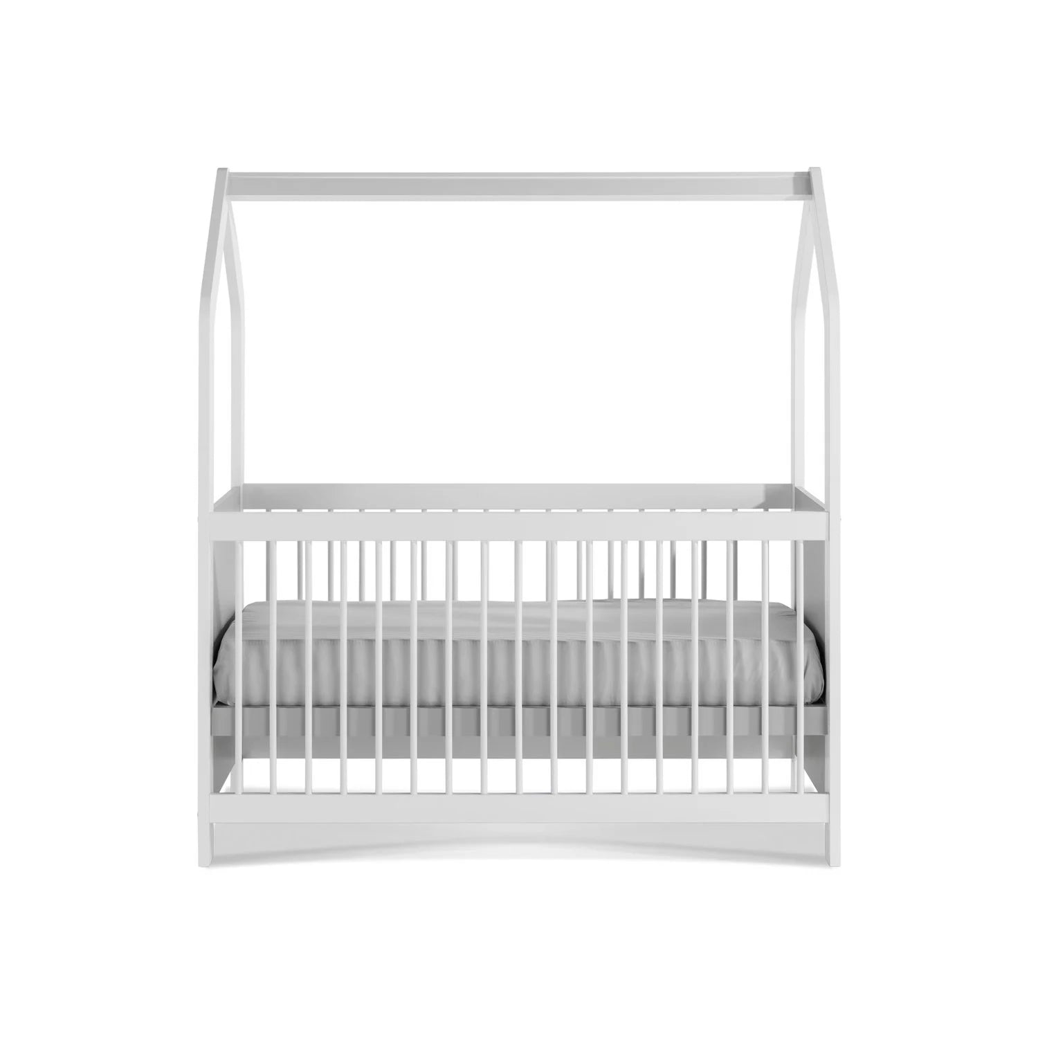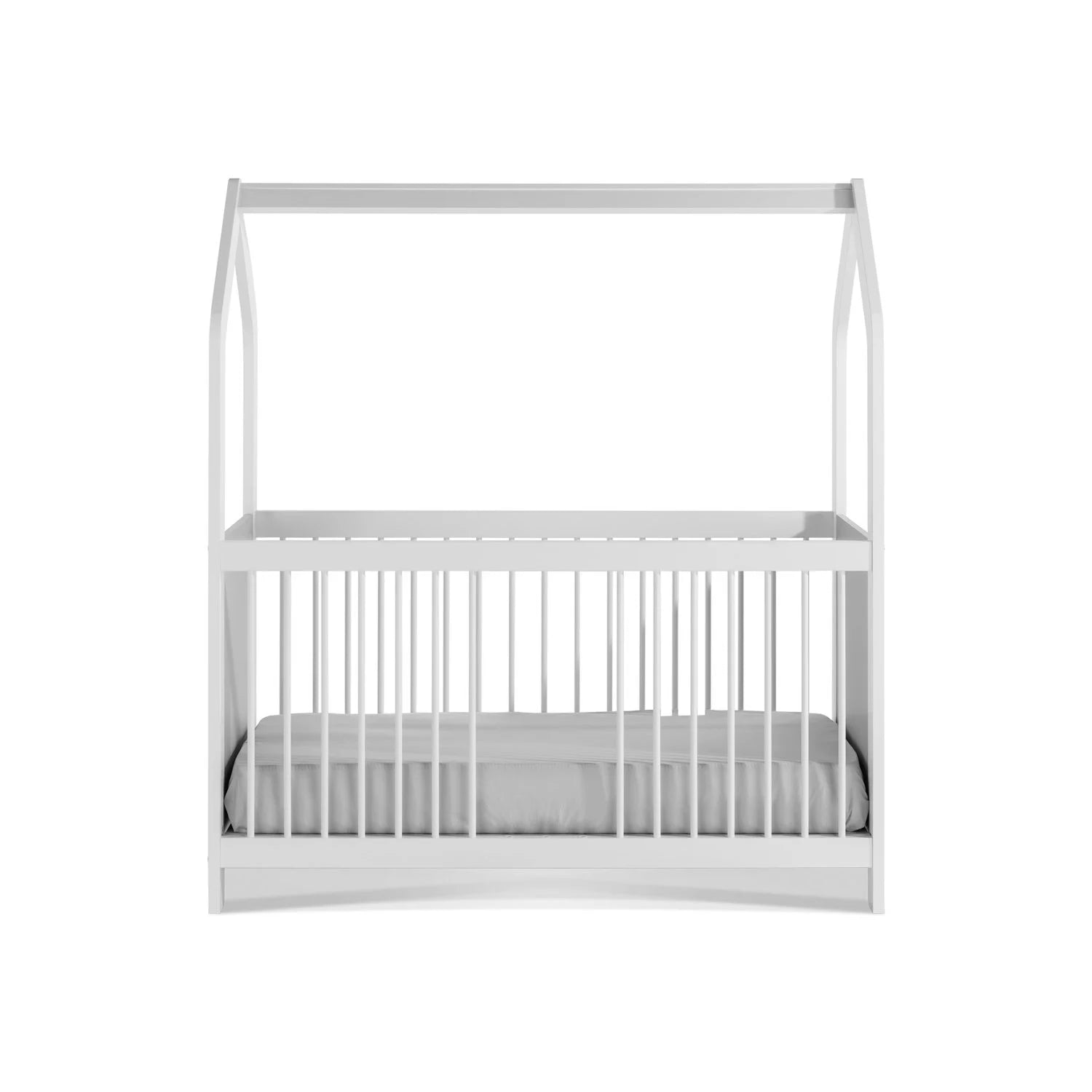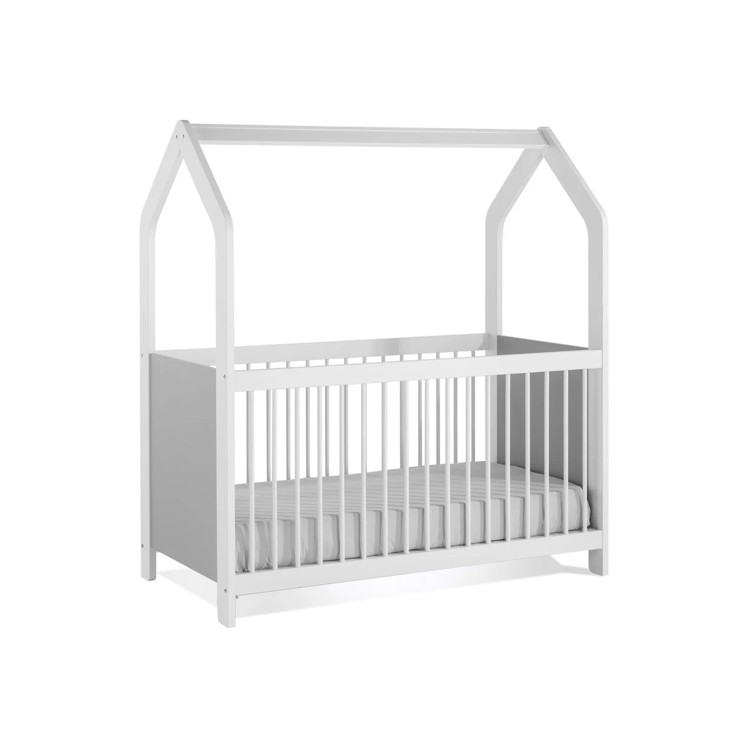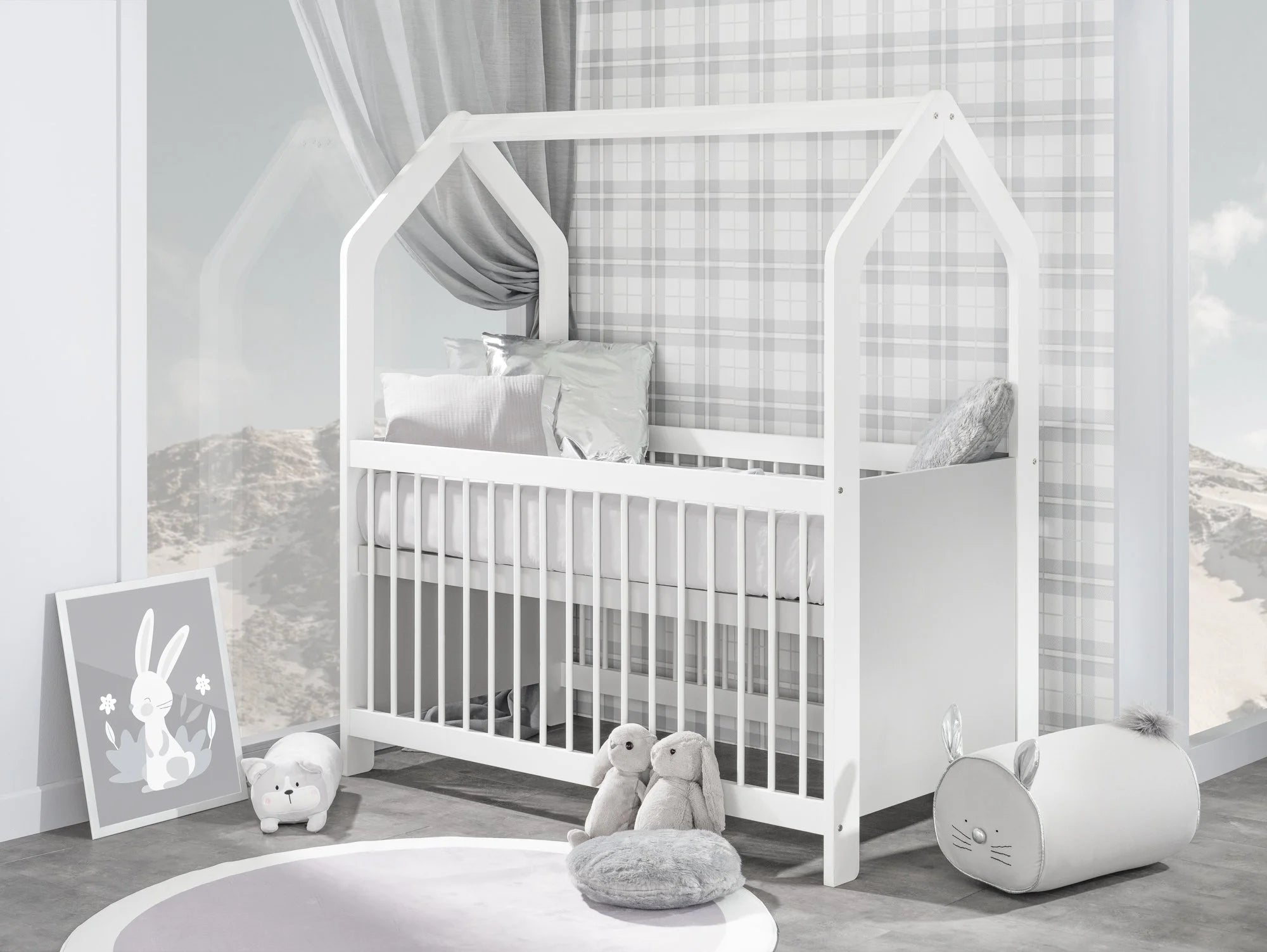 La struttura superiore richiama la silhouette di una casetta: un dettaglio semplice ma d’effetto che valorizza la cameretta e crea un “angolo nanna” rassicurante. Ideale per arredamenti neutri o più decorati.