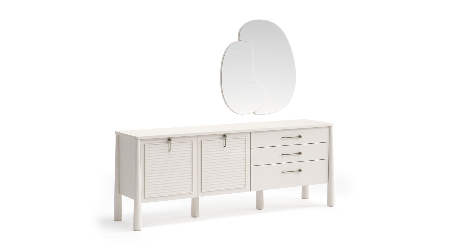 Salda si distingue per i suoi contrasti materici e formali: le ante della madia con lavorazione a persiana incontrano la morbidezza delle sedie imbottite e le linee smussate del tavolo. I piedini conici in legno di faggio e le maniglie in metallo anticato aggiungono un tocco di artigianalità e prestigio a ogni singolo pezzo.