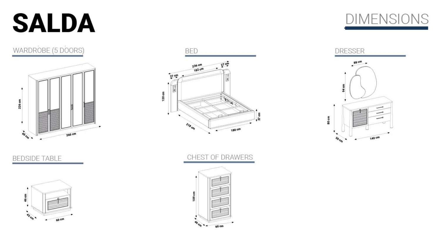 Ogni dettaglio di Salda racconta una storia di artigianalità moderna: le ante dell'armadio con lavorazione a persiana, le eleganti maniglie in metallo e i piedini conici in legno di faggio massello elevano lo stile della stanza. Ma non è solo estetica: i meccanismi di chiusura ammortizzata (soft-close) e le superfici facili da pulire garantiscono un comfort quotidiano superiore.