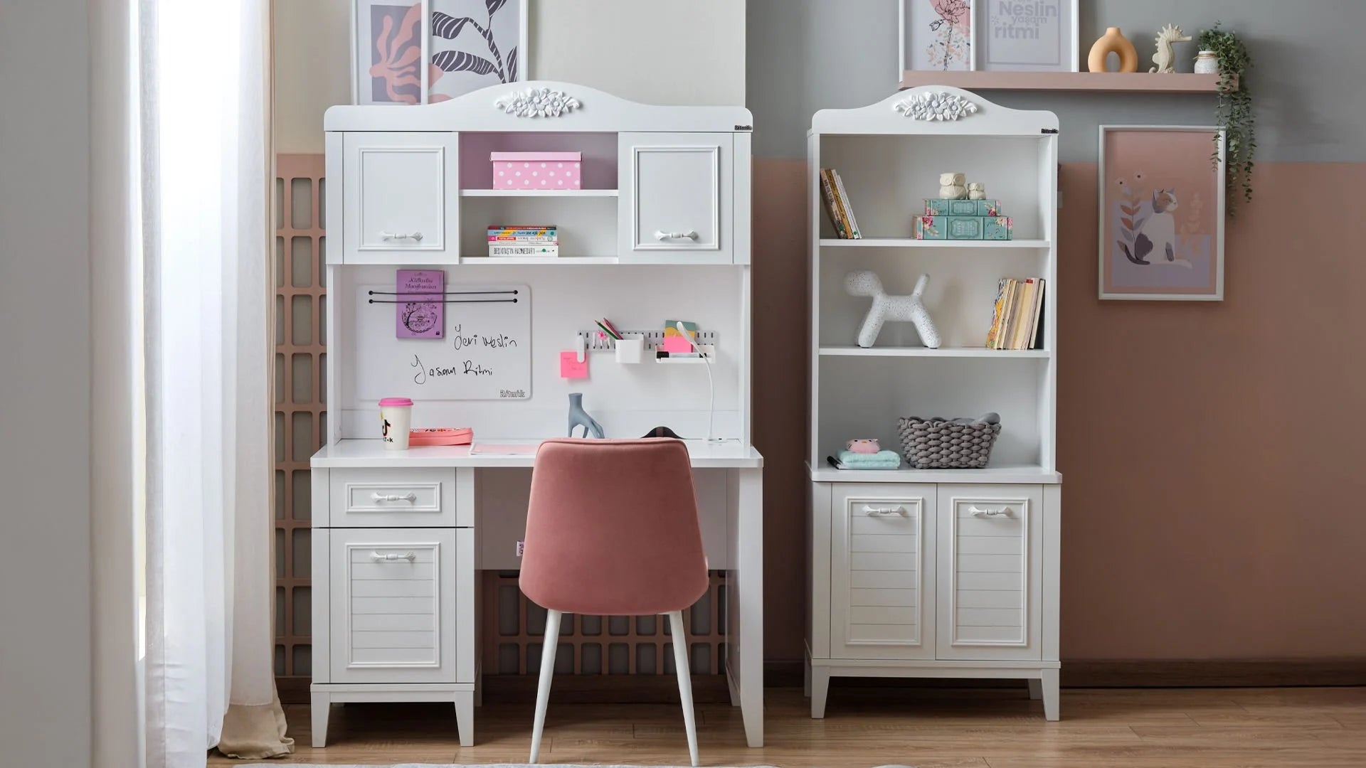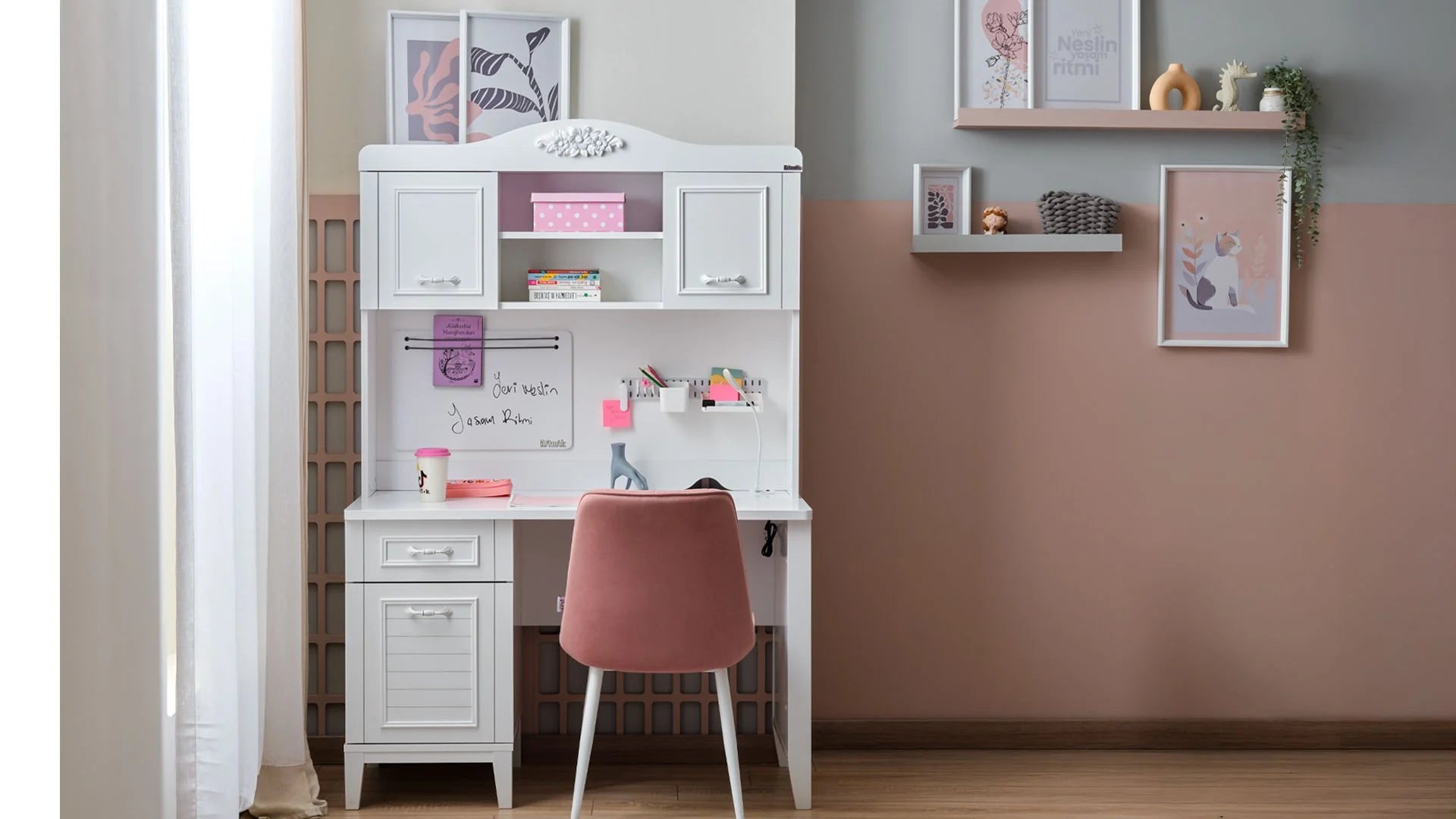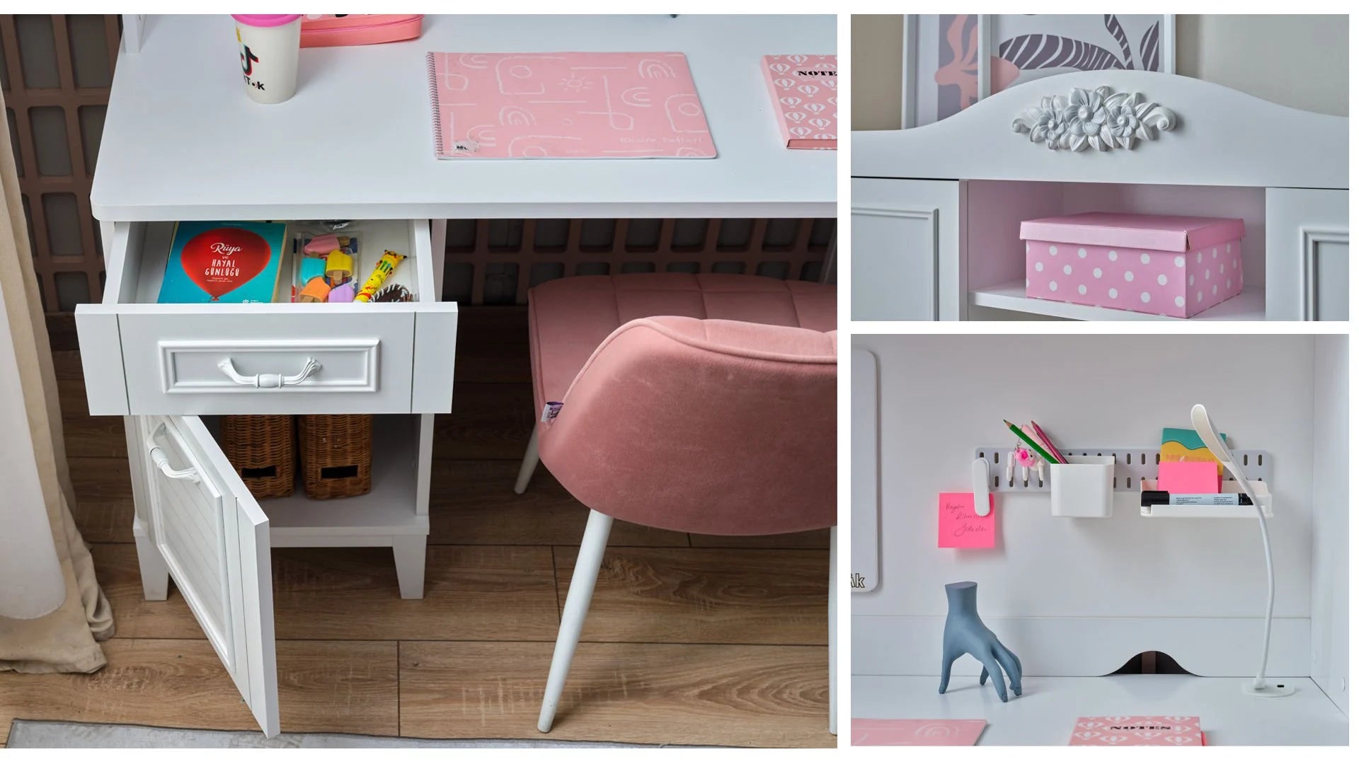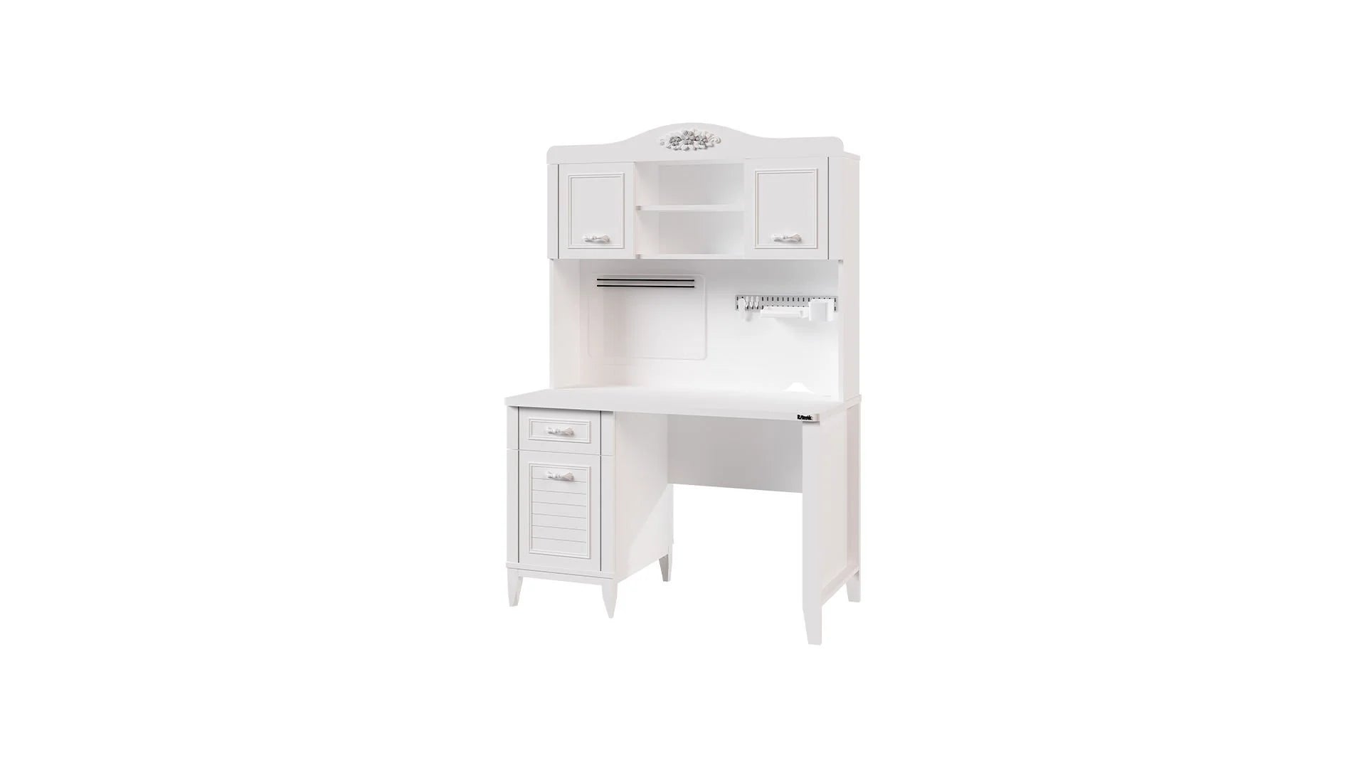 La Scrivania Marje con Modulo Superiore trasforma l'angolo studio in uno spazio da sogno, unendo un'estetica romantica e classica a soluzioni organizzative moderne e intelligenti. Progettata per offrire massima concentrazione e ordine, è realizzata in pannello truciolare nobilitato melaminico di altissima qualità e profili in MDF. Un prodotto eccellente, altamente resistente all'umidità e totalmente sicuro per la salute (completamente privo di sostanze cancerogene).