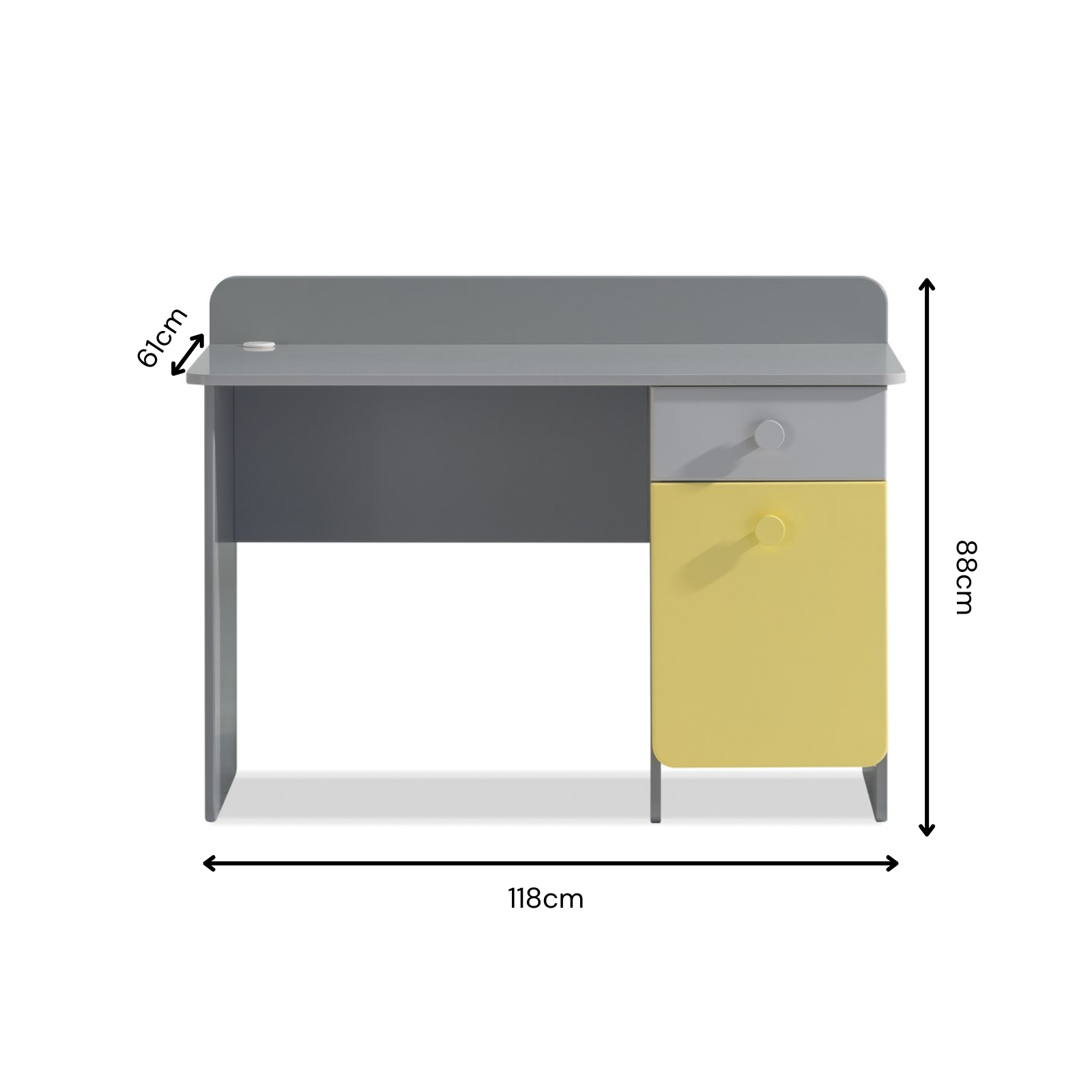 La scrivania Minia crea un angolo studio divertente e funzionale, perfettamente coordinato con gli altri mobili della collezione. Le linee morbide e i toni neutri con dettagli colorati si integrano facilmente in ogni cameretta, offrendo ai bambini uno spazio dedicato ai compiti, al disegno e al gioco creativo.