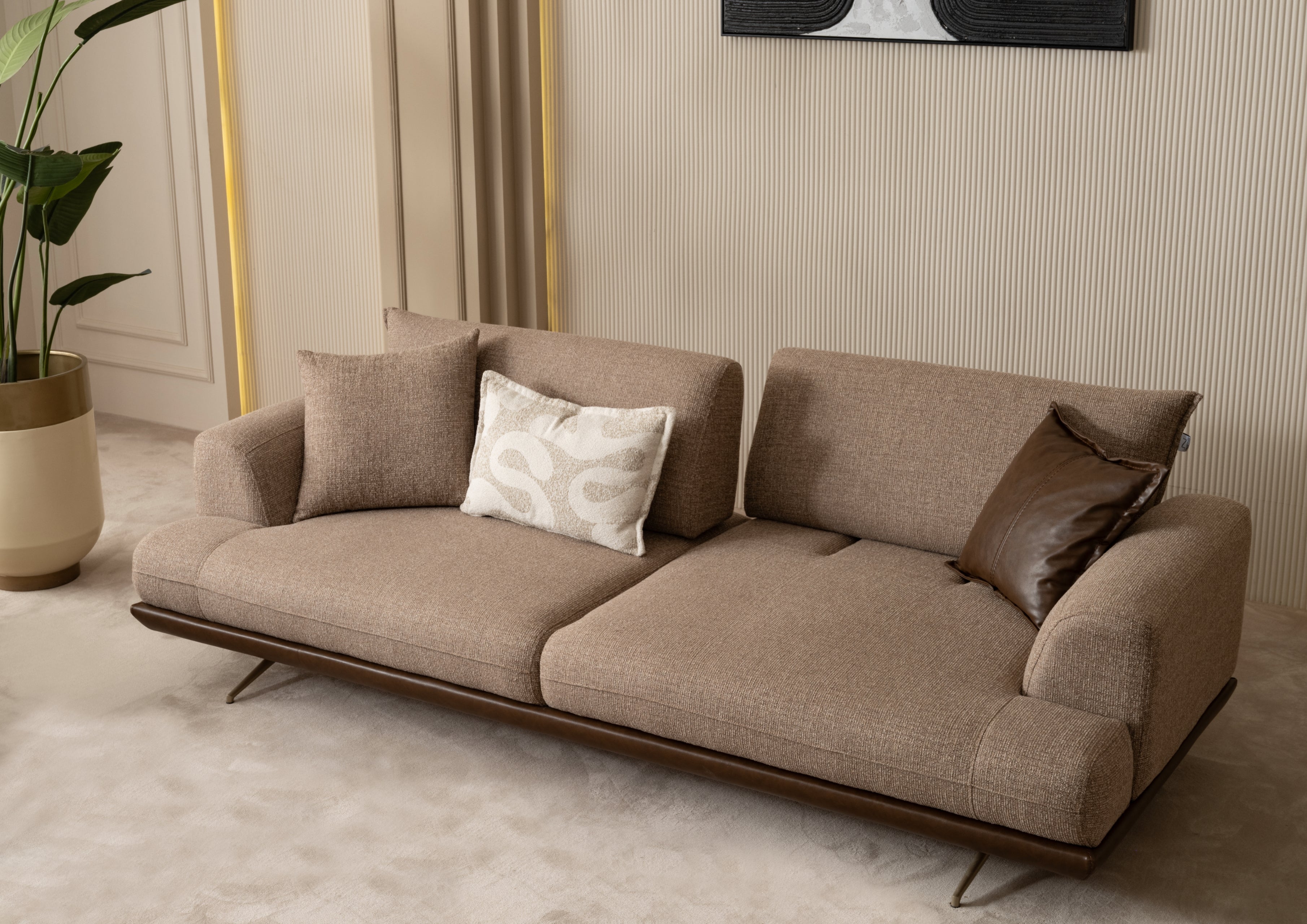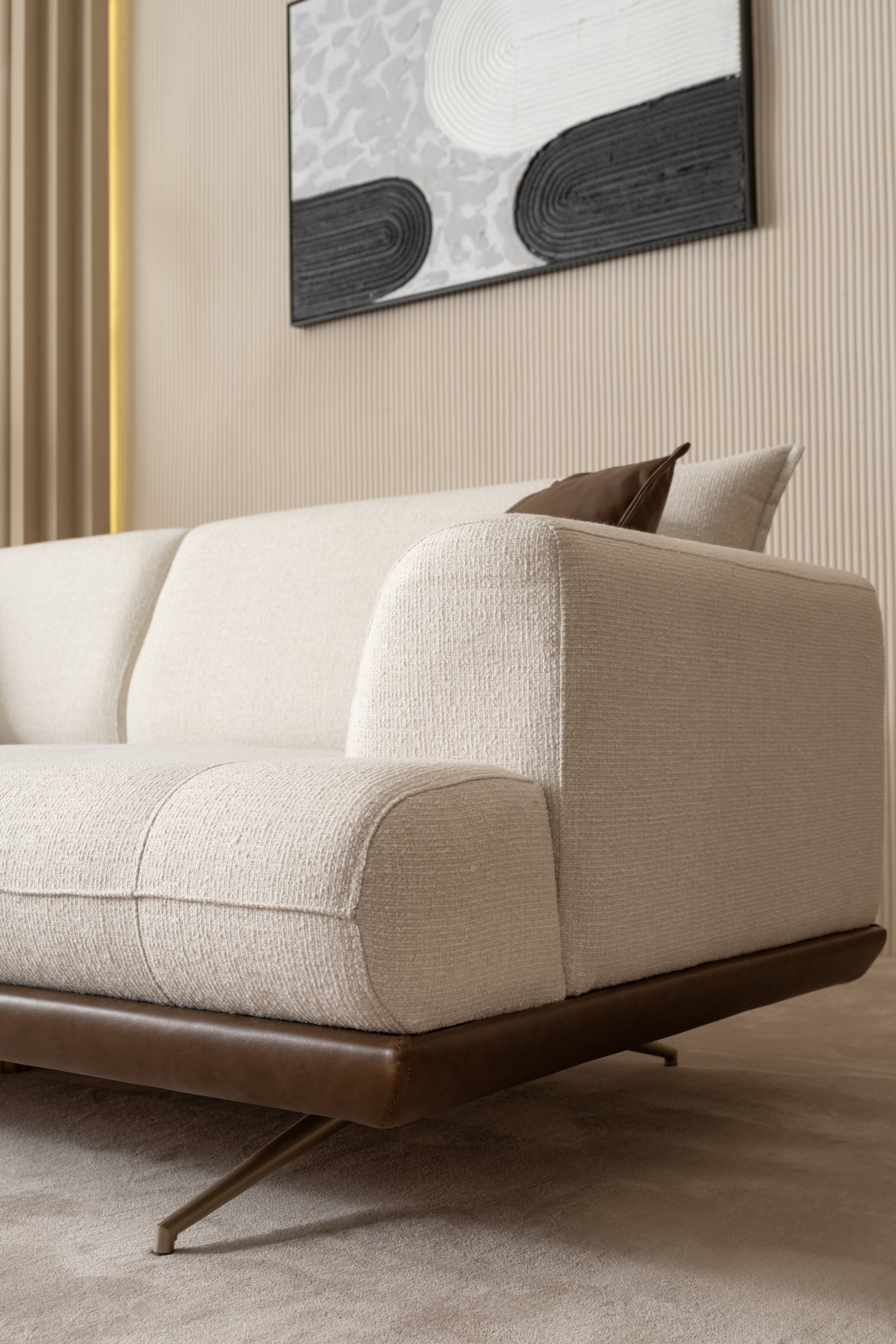 Il divano e la poltrona Sofia non sono semplici arredi, ma vere sculture domestiche. Caratterizzati da una struttura sinuosa e un basamento elegante, questi elementi si integrano perfettamente in ambienti sia moderni che classici. Il contrasto delicato dei materiali e la cura artigianale delle cuciture riflettono l'eccellenza della nostra selezione.